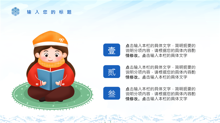PPT简介: 我的寒假生活读书安排计划ppt模板,蓝色为主色调,整体界面卡通风格,适用于我的寒假生活、寒假生活、快乐寒假、寒假时光、寒假计划、寒假收获、精彩寒假等相关主题设计应用。主体文字及图片可替换修改,文字修改均可直接点击文本框进行编辑,图片更改可选中图片后单击鼠标右键插入更换图片,也可根据自身需求增加和删除。本作品提供PPTX格式文件,转载请注明出处!