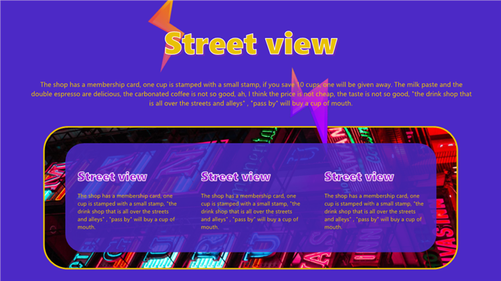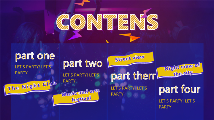PPT简介: 神秘动感紫光狂欢派对之夜ppt模板,紫色渐变为主色调,整体界面潮流时尚风格,适用于派对狂欢、节日派对、跨年狂欢等相关主题设计应用。主体文字及图片可替换修改,文字修改均可直接点击文本框进行编辑,图片更改可选中图片后单击鼠标右键插入更换图片,也可根据自身需求增加和删除。本作品提供PPTX格式文件,转载请注明出处!
