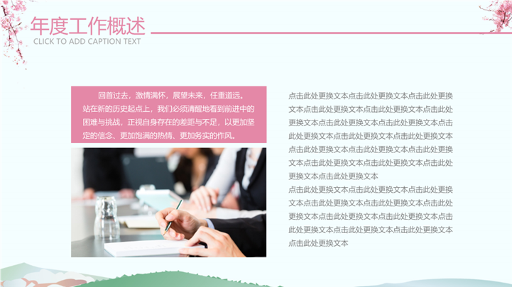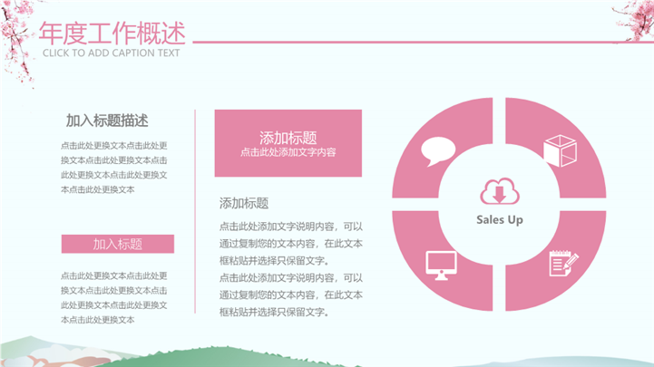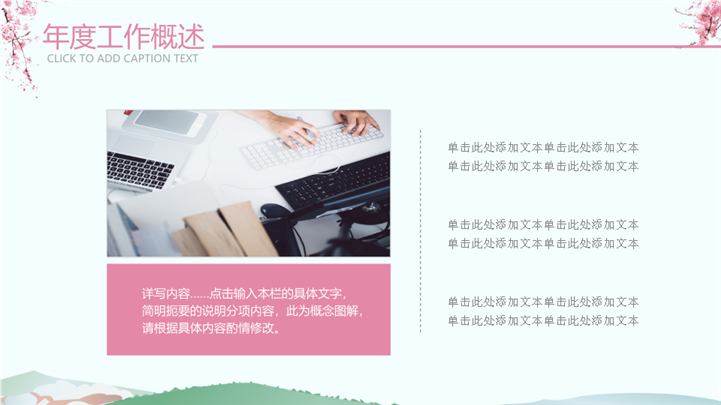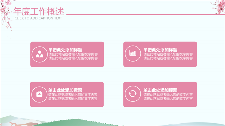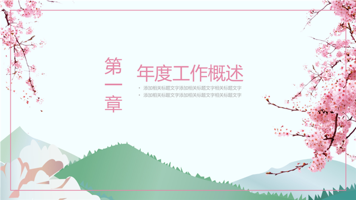 PPT简介: 粉色樱花日系文艺述职汇报报告ppt模板,粉色为主色调,整体界面日系文艺风格,主要包含年度工作概述、工作完成情况、成功项目展示、明年工作计划等模块内容,适用于大学生述职、实习转正述职、转正述职、试用期转正述职、商务述职、岗位竞聘、求职竞聘、个人履历、职场规划、晋升述职、述职报告等相关主题设计应用。主体文字及图片可替换修改,文字修改均可直接点击文本框进行编辑,图片更改可选中图片后单击鼠标右键插入更换图片,也可根据自身需求增加和删除。本作品提供PPTX格式文件,转载请注明出处!