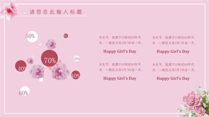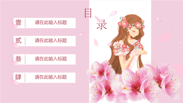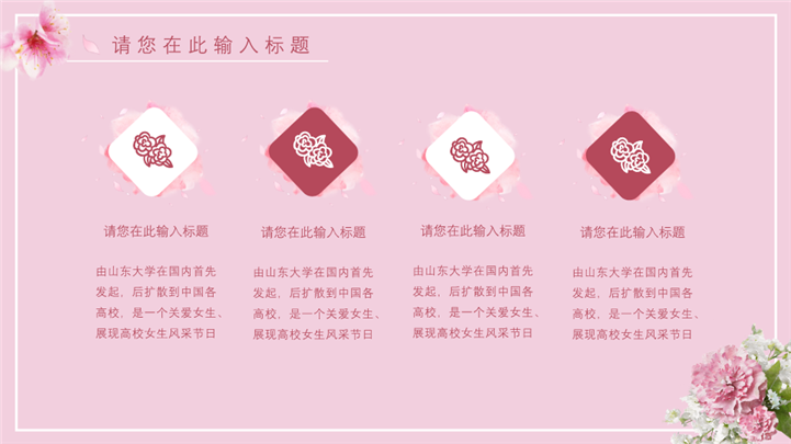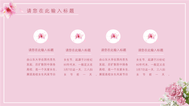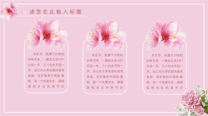 PPT简介: 花季绽放3.7女生节校园讲座ppt模板,粉色为主色调,整体界面唯美浪漫风格,适用于女生节、37女生节、女生节晚会、大学女生节、感恩母亲、妇女节班会、三八妇女节主题班会、38妇女节、歌颂女性、三八妇女节、女王节、女神节、三八节活动营销、38节活动策划、女王节等相关主题设计应用。主体文字及图片可替换修改,文字修改均可直接点击文本框进行编辑,图片更改可选中图片后单击鼠标右键插入更换图片,也可根据自身需求增加和删除。本作品提供PPTX格式文件,转载请注明出处!