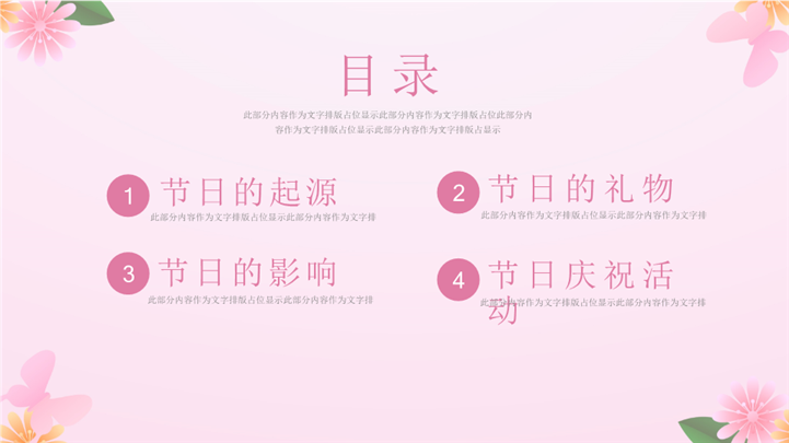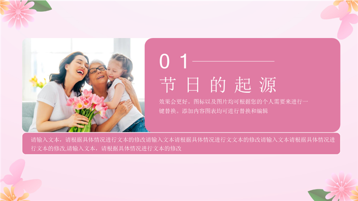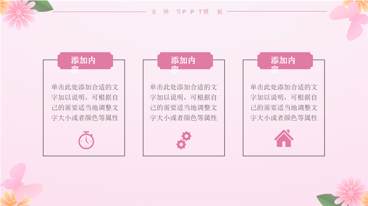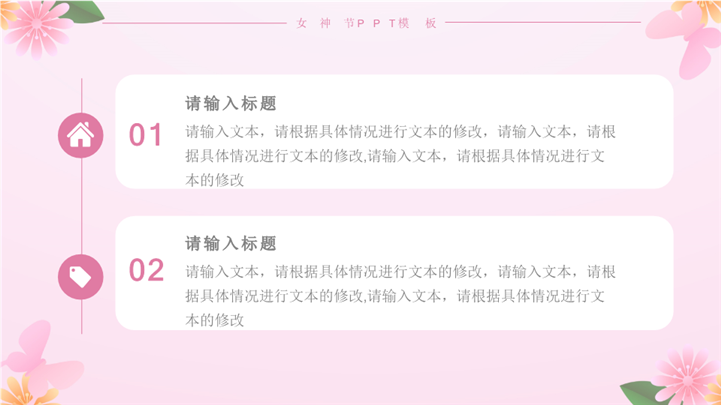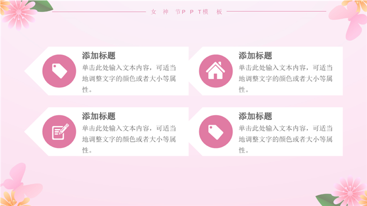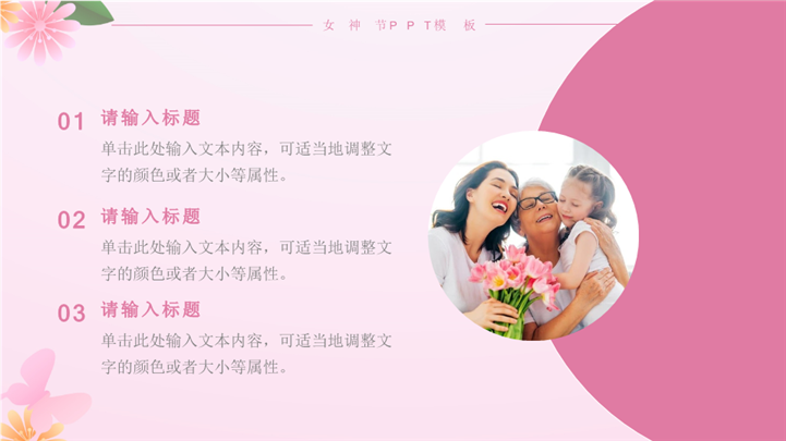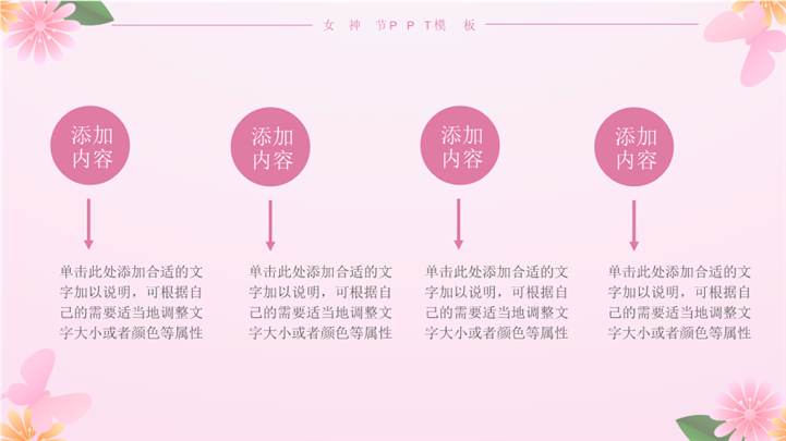 PPT简介: 大气三八女神节节日宣传策划ppt模板,粉色为主色调,整体界面简洁大方风格,适用于女生节、37女生节、女生节晚会、大学女生节、感恩母亲、妇女节班会、三八妇女节主题班会、38妇女节、歌颂女性、三八妇女节、女王节、女神节、三八节活动营销、38节活动策划、女王节等相关主题设计应用。主体文字及图片可替换修改,文字修改均可直接点击文本框进行编辑,图片更改可选中图片后单击鼠标右键插入更换图片,也可根据自身需求增加和删除。本作品提供PPTX格式文件,转载请注明出处!