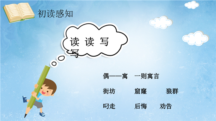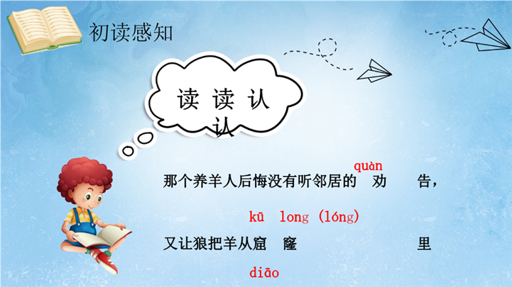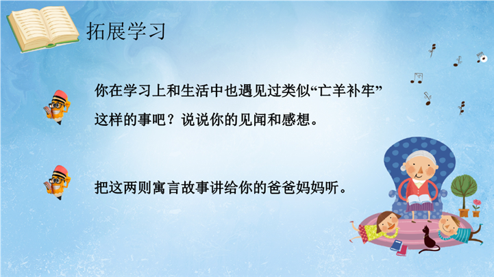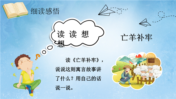 PPT简介: 卡通成语故事阅读赏析亡羊补牢ppt课件,浅蓝色为主色调,整体界面卡通风格,适用于教学分析、教学设计、教学说课、教学方案、公开课、教师公开课、公开课课件、教师工作总结等相关主题设计应用。主体文字及图片可替换修改,文字修改均可直接点击文本框进行编辑,图片更改可选中图片后单击鼠标右键插入更换图片,也可根据自身需求增加和删除。本作品提供PPTX格式文件,转载请注明出处!