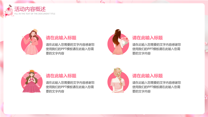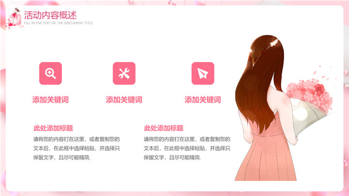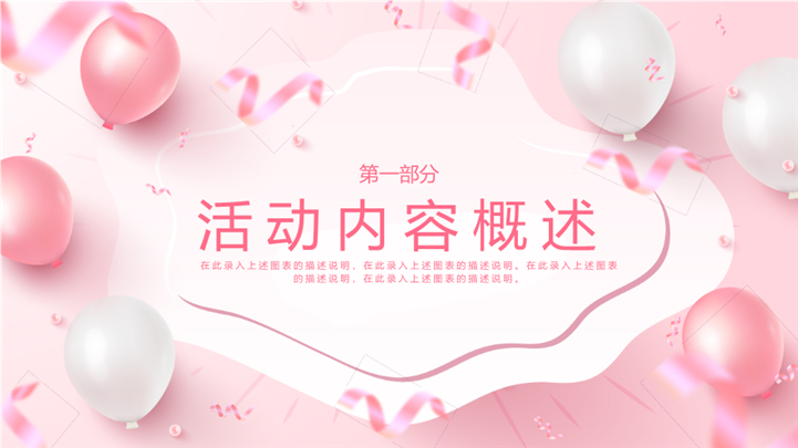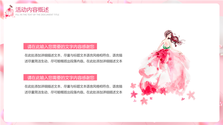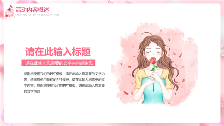 PPT简介: 优雅浪漫女神节主题沙龙ppt模板,粉色为主色调,整体界面唯美浪漫风格,适用于女生节、37女生节、女生节晚会、大学女生节、感恩母亲、妇女节班会、三八妇女节主题班会、38妇女节、歌颂女性、三八妇女节、女王节、女神节、三八节活动营销、38节活动策划、女王节等相关主题设计应用。主体文字及图片可替换修改,文字修改均可直接点击文本框进行编辑,图片更改可选中图片后单击鼠标右键插入更换图片,也可根据自身需求增加和删除。本作品提供PPTX格式文件,转载请注明出处!