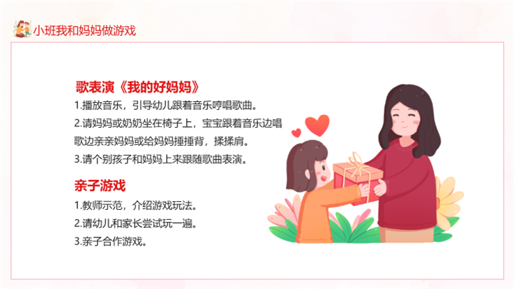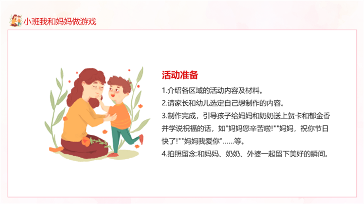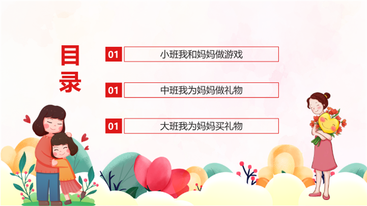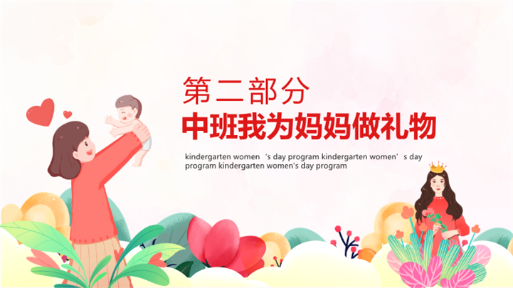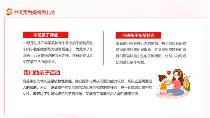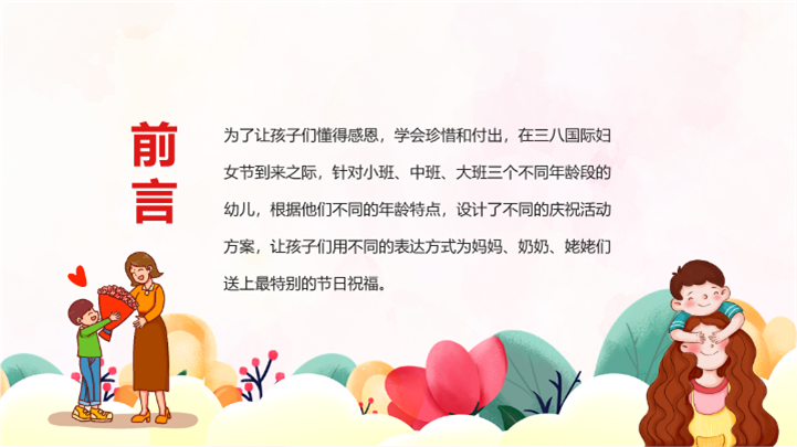 PPT简介: 幼儿园妇女节感恩母亲活动方案ppt模板,红色为主色调,整体界面可爱卡通风格,适用于女生节、37女生节、女生节晚会、大学女生节、感恩母亲、妇女节班会、三八妇女节主题班会、38妇女节、歌颂女性、三八妇女节、女王节、女神节、三八节活动营销、38节活动策划、女王节等相关主题设计应用。主体文字及图片可替换修改,文字修改均可直接点击文本框进行编辑,图片更改可选中图片后单击鼠标右键插入更换图片,也可根据自身需求增加和删除。本作品提供PPTX格式文件,转载请注明出处!
