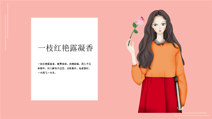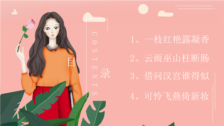PPT简介: 插画风灵动花季3.7女生节欢乐时光ppt模板,粉色为主色调,整体界面插画风格,适用于女生节、37女生节、女生节晚会、大学女生节、感恩母亲、妇女节班会、三八妇女节主题班会、38妇女节、歌颂女性、三八妇女节、女王节、女神节、三八节活动营销、38节活动策划、女王节等相关主题设计应用。主体文字及图片可替换修改,文字修改均可直接点击文本框进行编辑,图片更改可选中图片后单击鼠标右键插入更换图片,也可根据自身需求增加和删除。本作品提供PPTX格式文件,转载请注明出处!