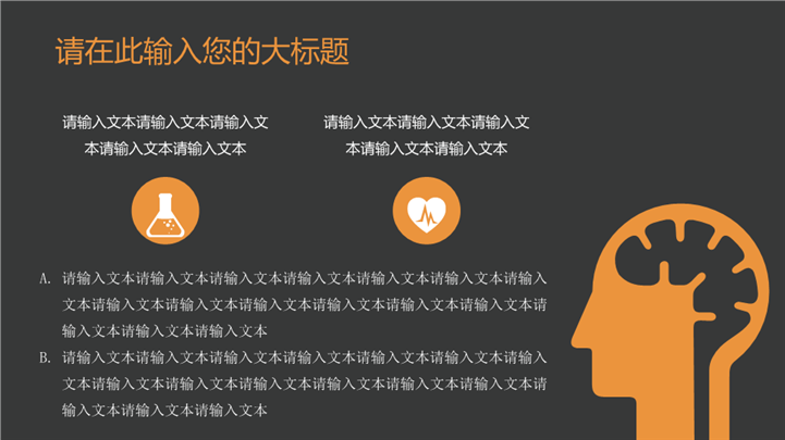 PPT简介: 脑科医疗保健医学总结汇报通用ppt模板,深灰色、橙色搭配为主色调,整体界面风格,适用于病例讨论、医疗、治疗、医学、报告、病例、蓝色医疗、治疗效果、医学报告、医学临床研究等相关主题设计应用。主体文字及图片可替换修改,文字修改均可直接点击文本框进行编辑,图片更改可选中图片后单击鼠标右键插入更换图片,也可根据自身需求增加和删除。本作品提供PPTX格式文件,转载请注明出处!