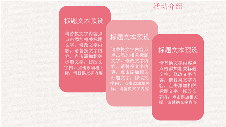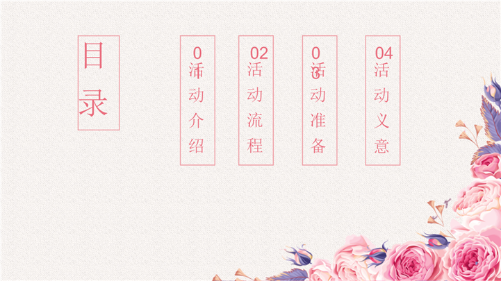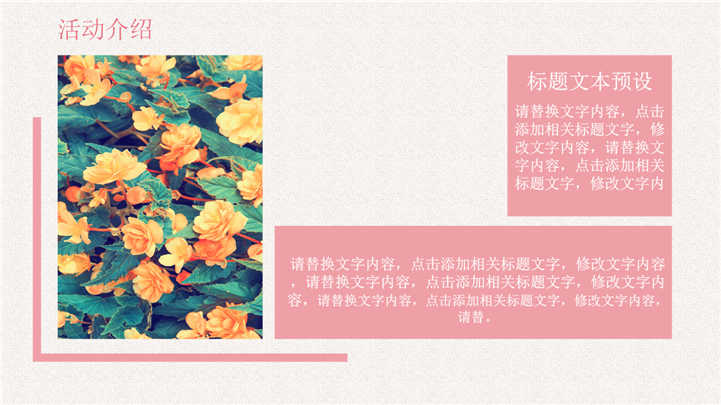 PPT简介: 花漾女神3.8妇女节活动策划ppt模板,粉色为主色调,整体界面简洁大方风格,适用于女生节、37女生节、女生节晚会、大学女生节、感恩母亲、妇女节班会、三八妇女节主题班会、38妇女节、歌颂女性、三八妇女节、女王节、女神节、三八节活动营销、38节活动策划、女王节等相关主题设计应用。主体文字及图片可替换修改,文字修改均可直接点击文本框进行编辑,图片更改可选中图片后单击鼠标右键插入更换图片,也可根据自身需求增加和删除。本作品提供PPTX格式文件,转载请注明出处!