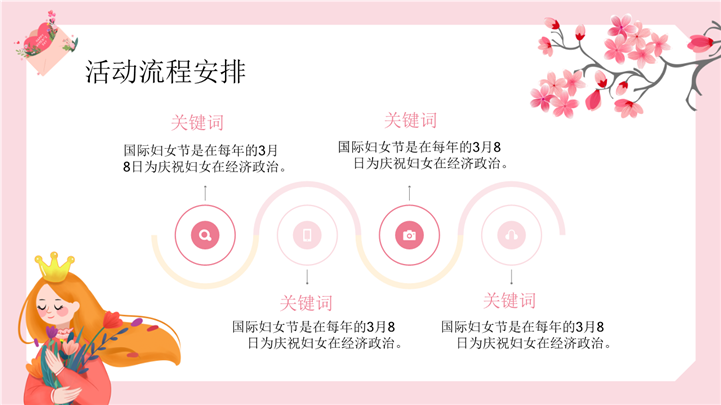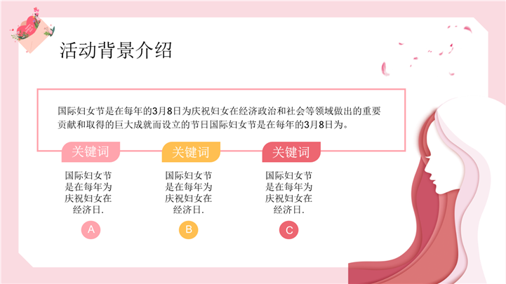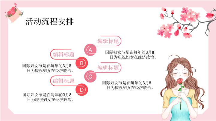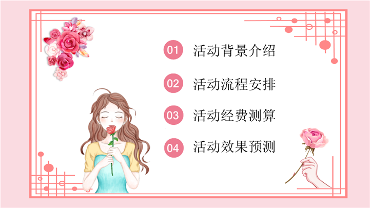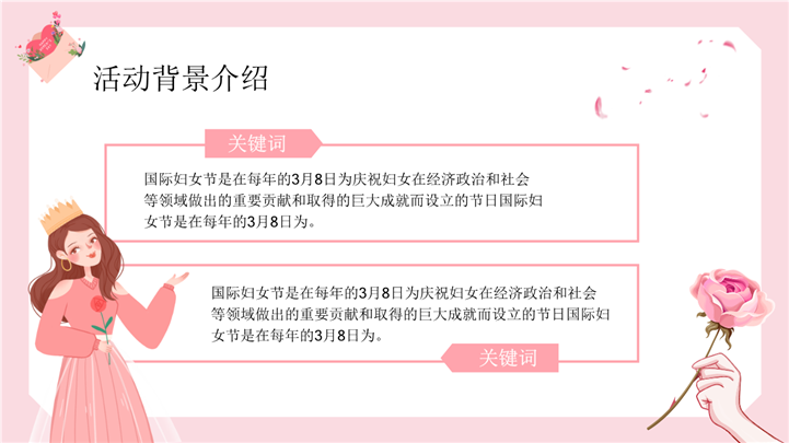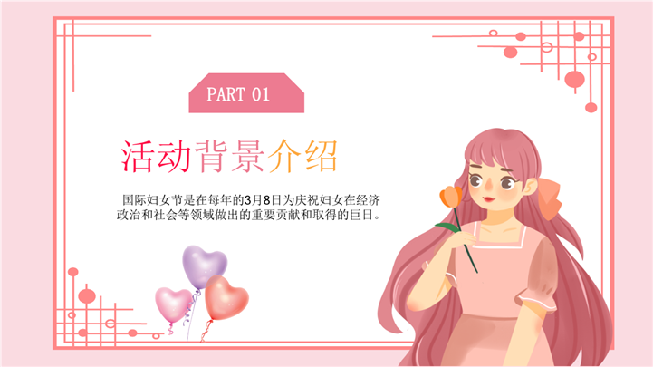 PPT简介: 国际妇女节女神节节日活动ppt模板,粉色为主色调,整体界面唯美卡通风格,适用于女生节、37女生节、女生节晚会、大学女生节、感恩母亲、妇女节班会、三八妇女节主题班会、38妇女节、歌颂女性、三八妇女节、女王节、女神节、三八节活动营销、38节活动策划、女王节等相关主题设计应用。主体文字及图片可替换修改,文字修改均可直接点击文本框进行编辑,图片更改可选中图片后单击鼠标右键插入更换图片,也可根据自身需求增加和删除。本作品提供PPTX格式文件,转载请注明出处!