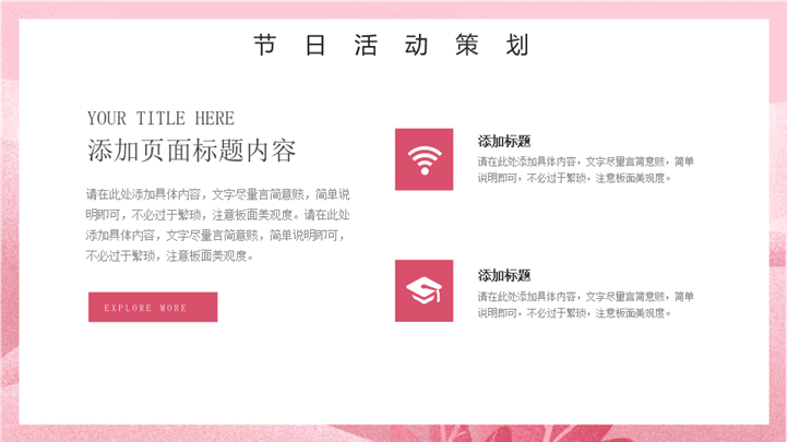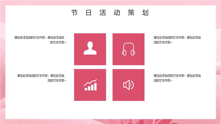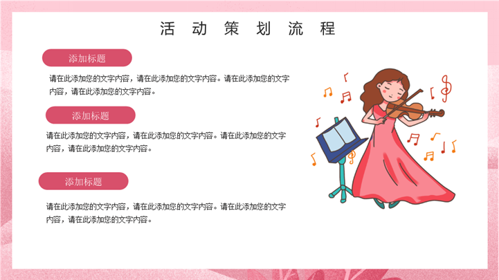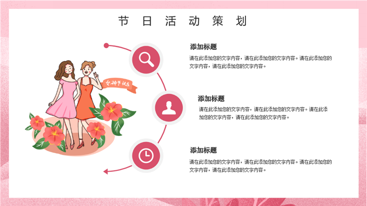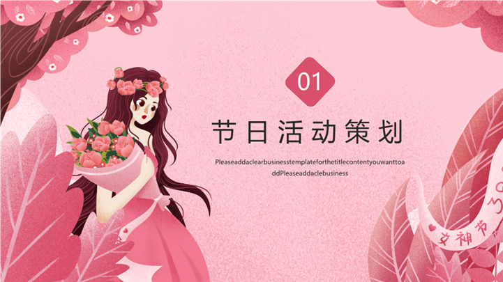 PPT简介: 优雅38女王节女神节活动策划ppt模板,粉色为主色调,整体界面卡通浪漫风格,适用于女生节、37女生节、女生节晚会、大学女生节、感恩母亲、妇女节班会、三八妇女节主题班会、38妇女节、歌颂女性、三八妇女节、女王节、女神节、三八节活动营销、38节活动策划、女王节等相关主题设计应用。主体文字及图片可替换修改,文字修改均可直接点击文本框进行编辑,图片更改可选中图片后单击鼠标右键插入更换图片,也可根据自身需求增加和删除。本作品提供PPTX格式文件,转载请注明出处!