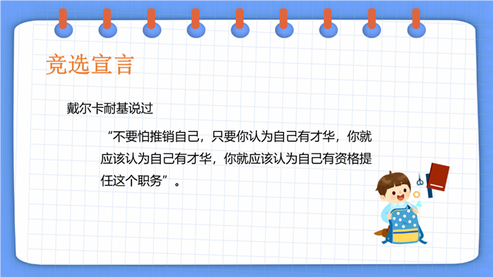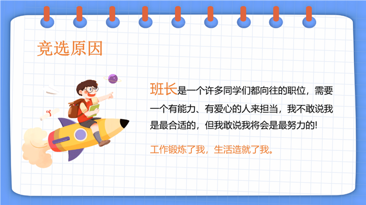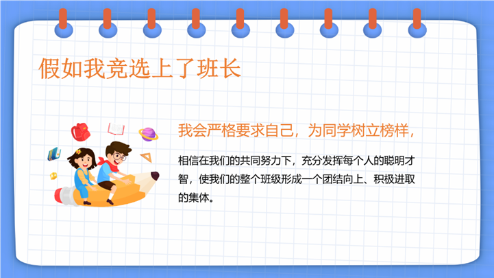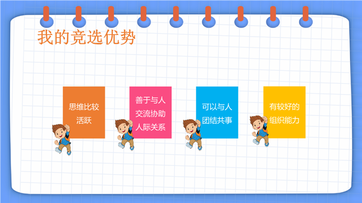 PPT简介: 童趣校园小学生班干部竞选ppt模板,紫色为主色调,整体界面可爱卡通风格,适用于我的介绍、我的家庭、我的兴趣、我的学习,适用于新生自我介绍、小学生自我介绍、兴趣爱好展示、开学自我介绍、迎新会自我介绍、班级破冰活动等相关主题设计应用。主体文字及图片可替换修改,文字修改均可直接点击文本框进行编辑,图片更改可选中图片后单击鼠标右键插入更换图片,也可根据自身需求增加和删除。本作品提供PPTX格式文件,转载请注明出处!