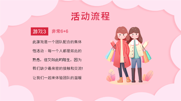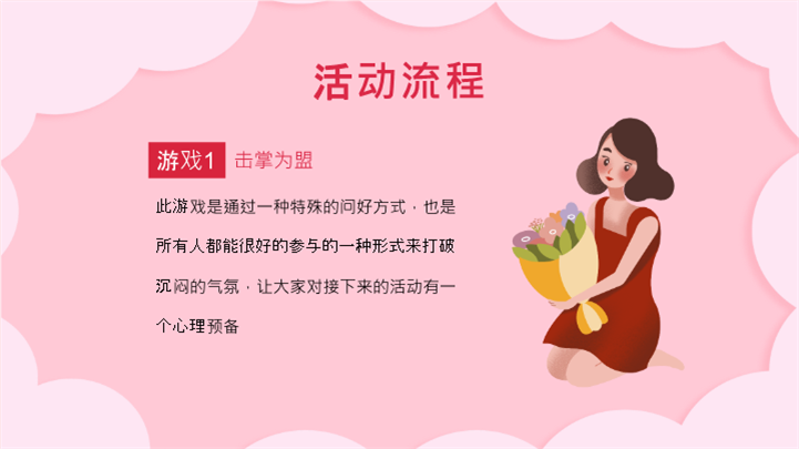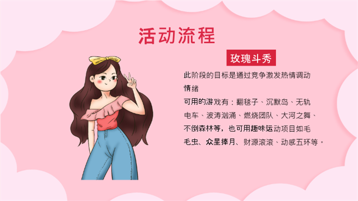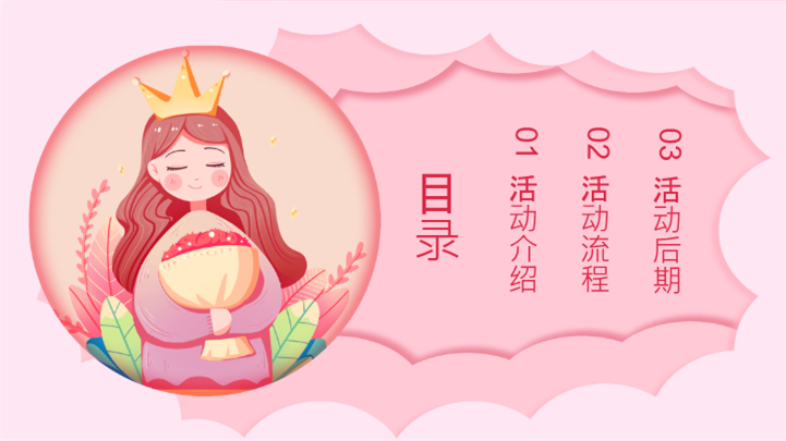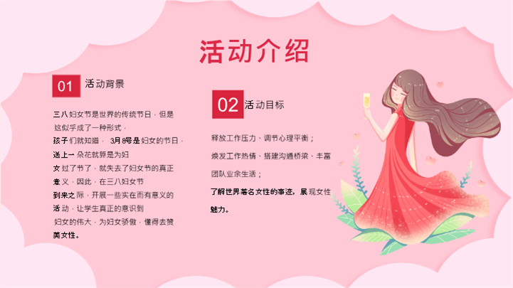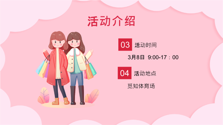 PPT简介: 粉色可爱温馨女神节活动策划ppt模板,粉色为主色调,整体界面可爱温馨风格,适用于女生节、37女生节、女生节晚会、大学女生节、感恩母亲、妇女节班会、三八妇女节主题班会、38妇女节、歌颂女性、三八妇女节、女王节、女神节、三八节活动营销、38节活动策划、女王节等相关主题设计应用。主体文字及图片可替换修改,文字修改均可直接点击文本框进行编辑,图片更改可选中图片后单击鼠标右键插入更换图片,也可根据自身需求增加和删除。本作品提供PPTX格式文件,转载请注明出处!