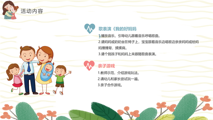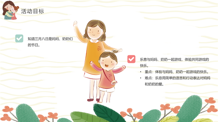 PPT简介: 可爱插画风庆祝女神节幼儿园活动方案ppt模板,整体界面可爱插画风格,适用于女生节、37女生节、女生节晚会、大学女生节、感恩母亲、妇女节班会、三八妇女节主题班会、38妇女节、歌颂女性、三八妇女节、女王节、女神节、三八节活动营销、38节活动策划、女王节等相关主题设计应用。主体文字及图片可替换修改,文字修改均可直接点击文本框进行编辑,图片更改可选中图片后单击鼠标右键插入更换图片,也可根据自身需求增加和删除。本作品提供PPTX格式文件,转载请注明出处!