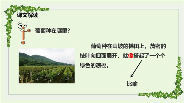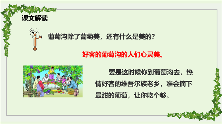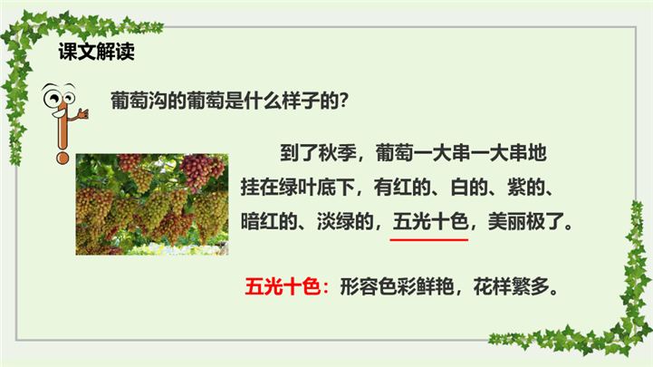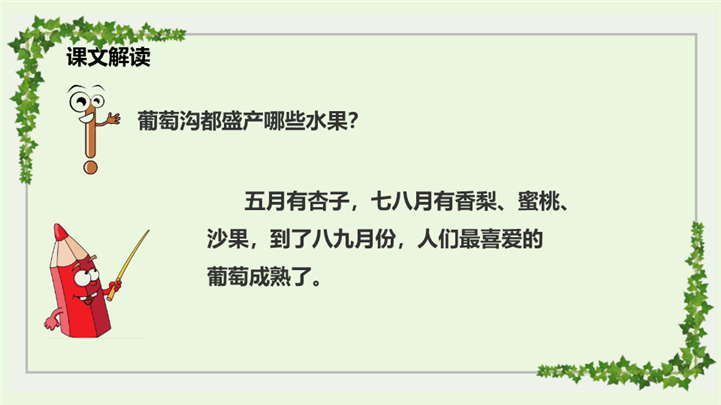 PPT简介: 人教版小学语文二年级上册葡萄沟ppt课件,浅绿色为主色调,整体界面水彩风格,适用于教学分析、教学设计、教学说课、教学方案、公开课、教师公开课、公开课课等相关主题设计应用。主体文字及图片可替换修改,文字修改均可直接点击文本框进行编辑,图片更改可选中图片后单击鼠标右键插入更换图片,也可根据自身需求增加和删除。本作品提供PPTX格式文件,转载请注明出处!