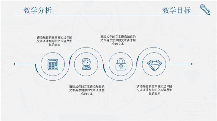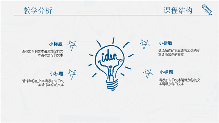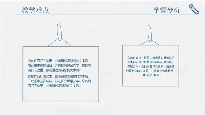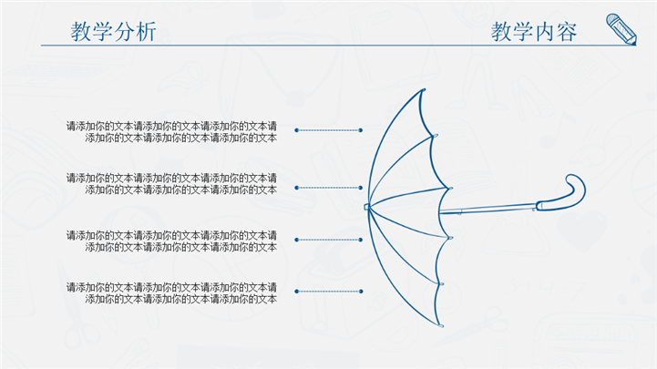 PPT简介: 手绘插图风格教师说课学术演示ppt模板,蓝色为主色调,整体界面手绘风格,适用于教学分析、教学设计、教学说课、教学方案、公开课、教师公开课、公开课课件等相关主题设计应用。主体文字及图片可替换修改,文字修改均可直接点击文本框进行编辑,图片更改可选中图片后单击鼠标右键插入更换图片,也可根据自身需求增加和删除。本作品提供PPTX格式文件,转载请注明出处!
