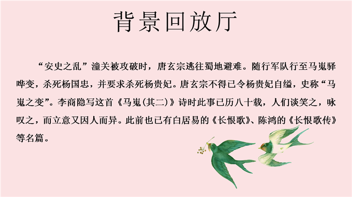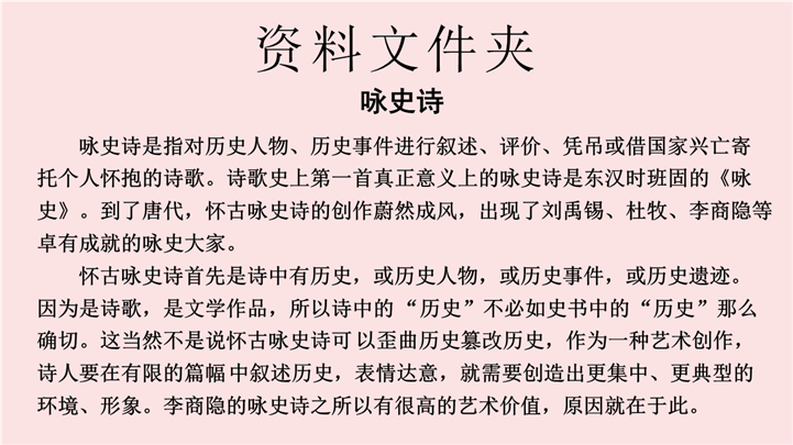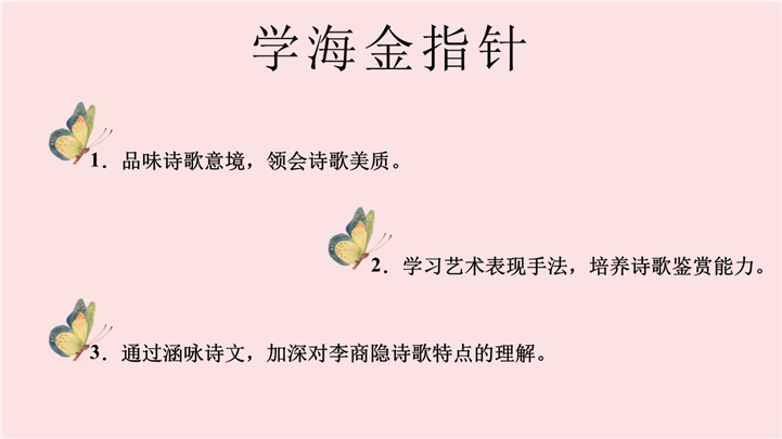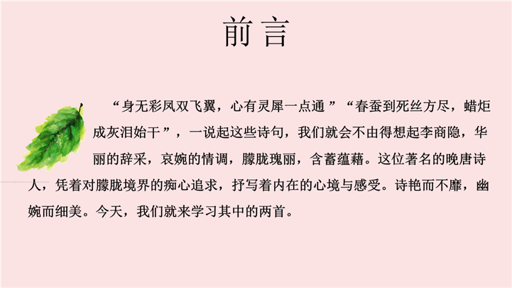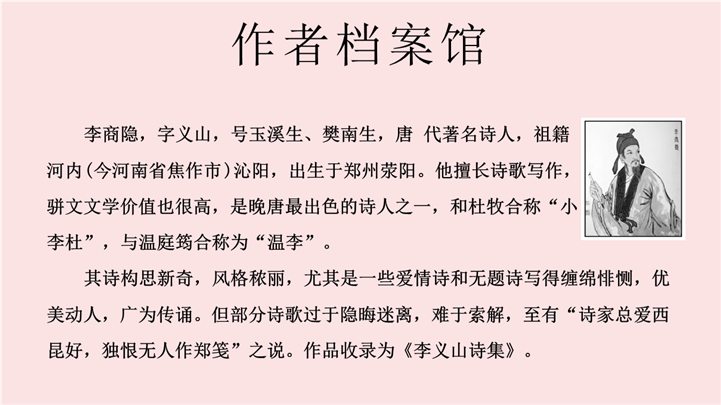 PPT简介: 粉色唯美李商隐诗两首语文ppt课件,浅粉色为主色调,整体界面唯美简约风格,适用于工教学分析、教学设计、教学说课、教学方案、公开课、教师公开课、公开课课件、教师工作总结等相关主题设计应用。主体文字及图片可替换修改,文字修改均可直接点击文本框进行编辑,图片更改可选中图片后单击鼠标右键插入更换图片,也可根据自身需求增加和删除。本作品提供PPTX格式文件,转载请注明出处!