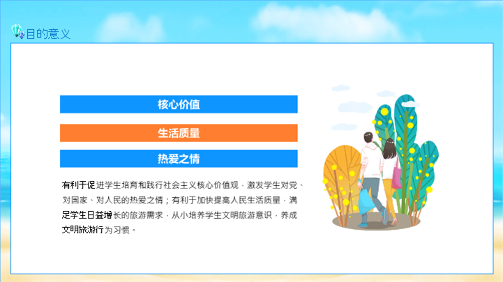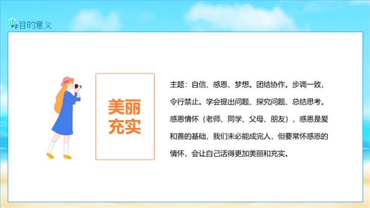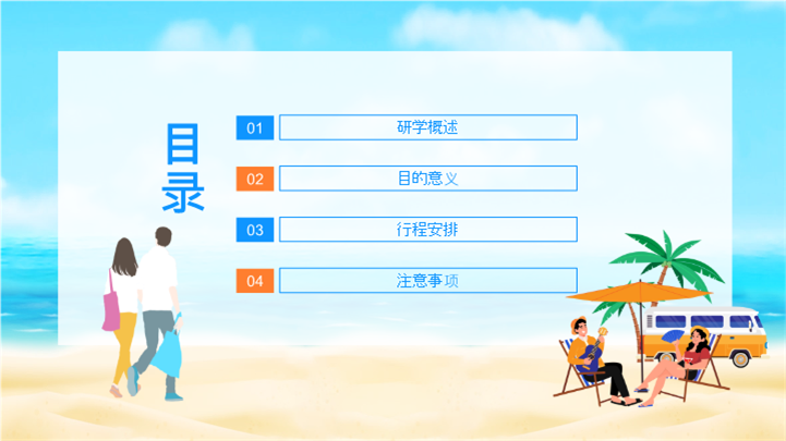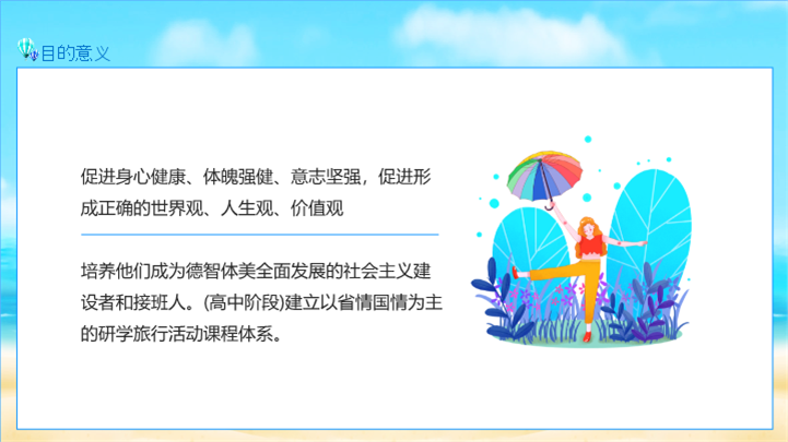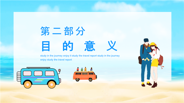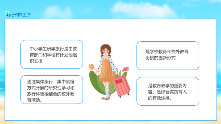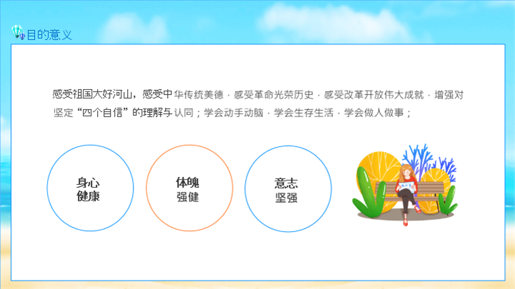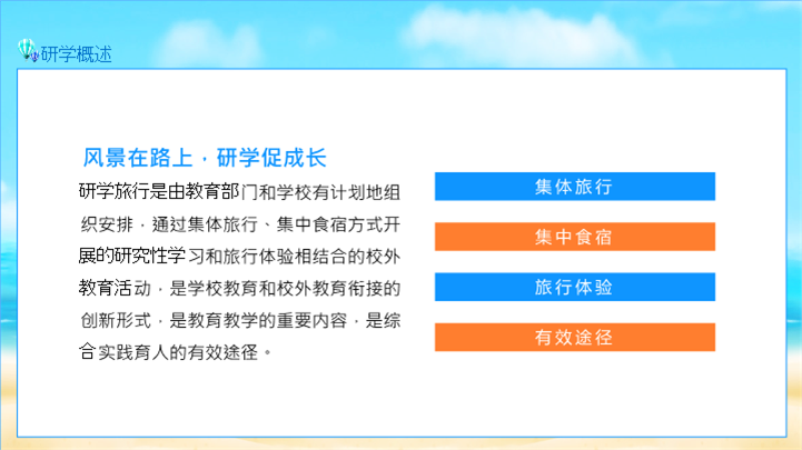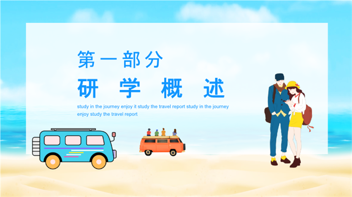 PPT简介: 青少年夏令营研学旅行报告ppt模板,天蓝色为主色调,整体界面卡通风格,适用于研学旅行、研学报告、亲子研学、农场研学、研学运动会、户外主题活动、露营活动策划、露营宣传推广等相关主题设计应用。主体文字及图片可替换修改,文字修改均可直接点击文本框进行编辑,图片更改可选中图片后单击鼠标右键插入更换图片,也可根据自身需求增加和删除。本作品提供PPTX格式文件,转载请注明出处!