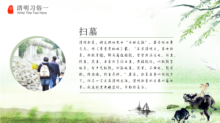 PPT简介: 春和景明哀悼追思清明节ppt模板,绿色为主色调,整体界面中国风风格,适用于清明、清明节、清明节班会、清明主题、烟雨清明、清明祭祖、清明节宣传、清明节传统节日等相关主题设计应用。主体文字及图片可替换修改,文字修改均可直接点击文本框进行编辑,图片更改可选中图片后单击鼠标右键插入更换图片,也可根据自身需求增加和删除。本作品提供PPTX格式文件,转载请注明出处!