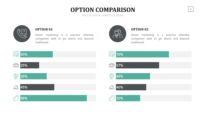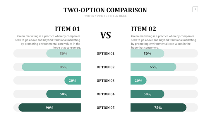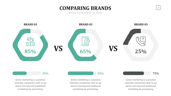 PPT简介: 市场竞争力品牌对比分析ppt图表,绿色为主色调,整体界面简洁商务风格,适用于展示数据比例、突出视觉效果、表现数据统计、加工形状美化、整合其他图表等相关主题设计应用。主体文字及图片可替换修改,文字修改均可直接点击文本框进行编辑,图片更改可选中图片后单击鼠标右键插入更换图片,也可根据自身需求增加和删除。本作品提供PPTX格式文件,转载请注明出处!