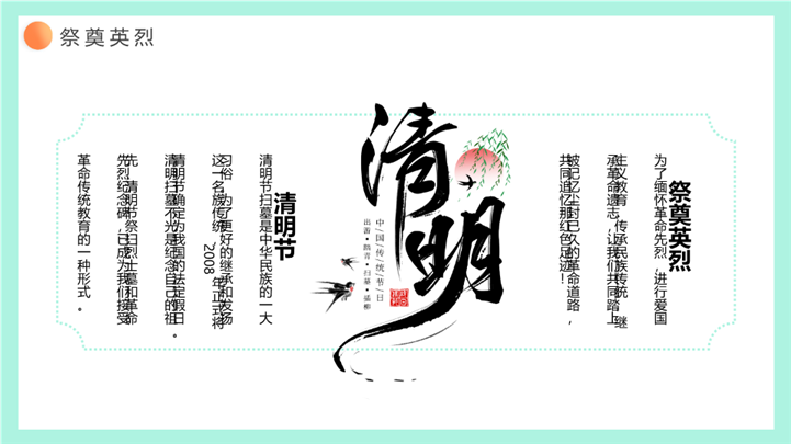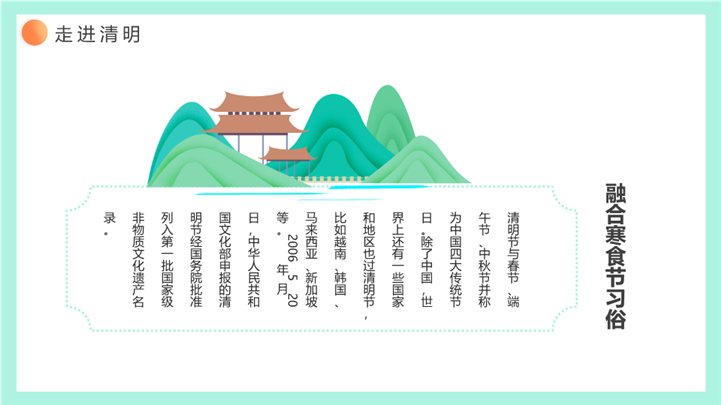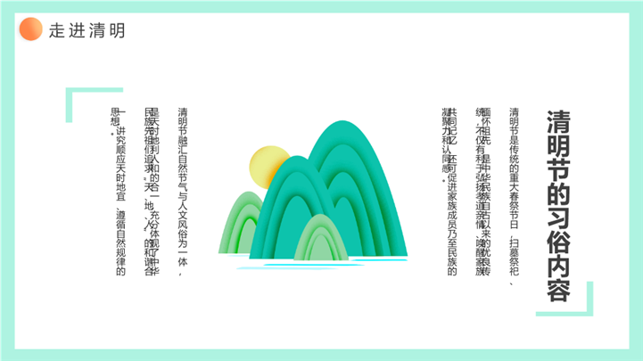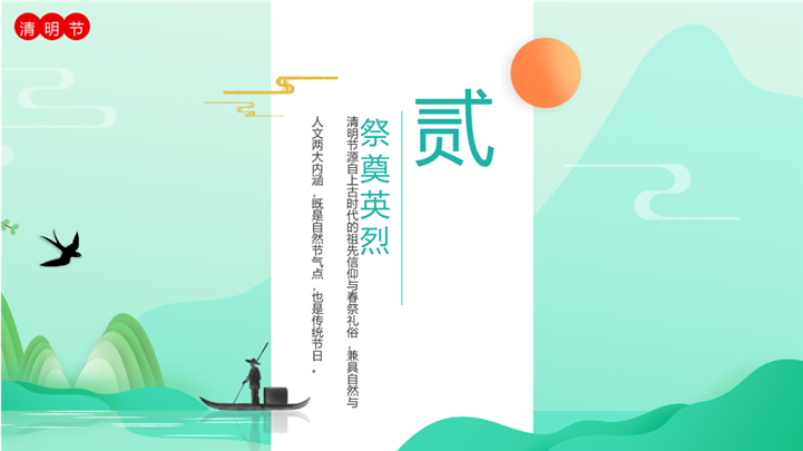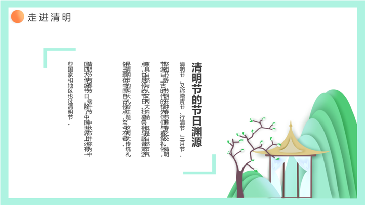 PPT简介: 清新自然中小学生清明节主题班会ppt模板,绿色为主色调,整体界面矢量清新风格,适用于清明、清明节、清明节班会、清明主题、烟雨清明、清明祭祖、清明节宣传、清明节传统节日等相关主题设计应用。主体文字及图片可替换修改,文字修改均可直接点击文本框进行编辑,图片更改可选中图片后单击鼠标右键插入更换图片,也可根据自身需求增加和删除。本作品提供PPTX格式文件,转载请注明出处!