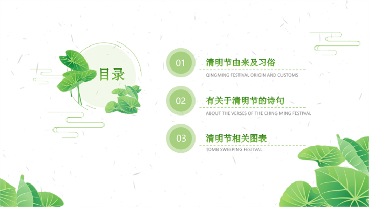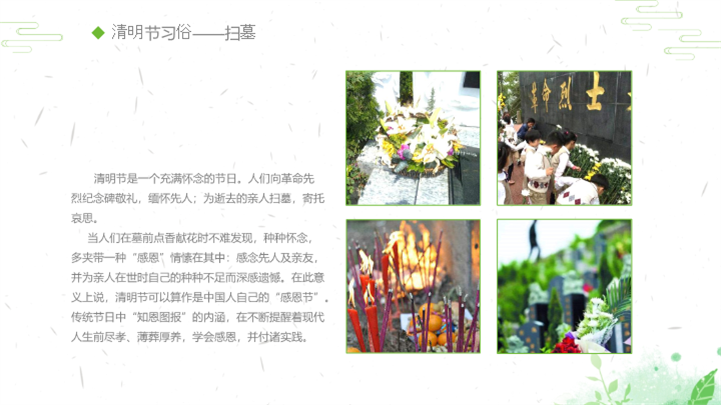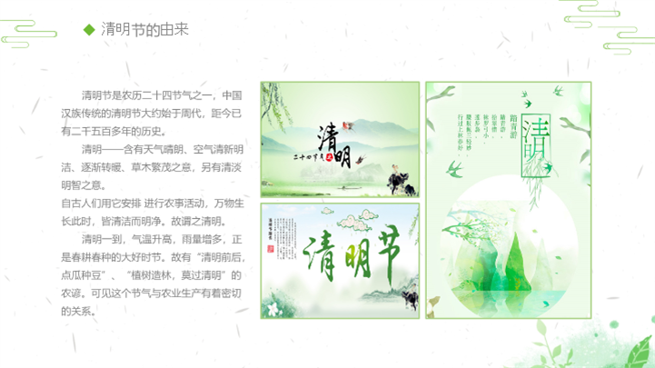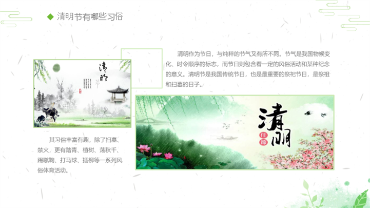 PPT简介: 清新春日祭祖哀思缅怀清明节ppt模板,淡绿色为主色调,整体界面清新风格,适用于清明、清明节、清明节班会、清明主题、烟雨清明、清明祭祖、清明节宣传、清明节传统节日等相关主题设计应用。主体文字及图片可替换修改,文字修改均可直接点击文本框进行编辑,图片更改可选中图片后单击鼠标右键插入更换图片,也可根据自身需求增加和删除。本作品提供PPTX格式文件,转载请注明出处!