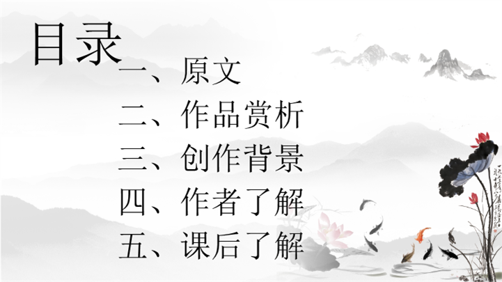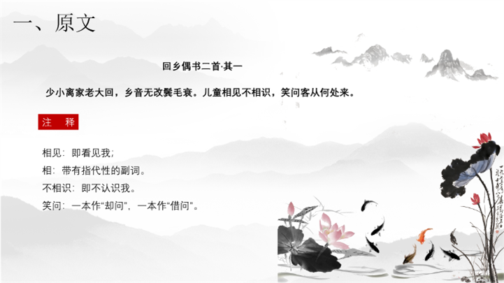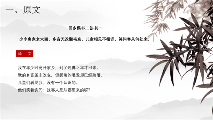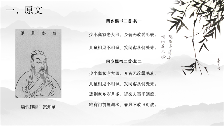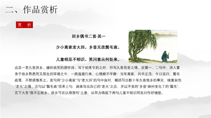 PPT简介: 中国风语文课件回乡偶书ppt模板,灰色为主色调,整体界面中国风风格,适用于工教学分析、教学设计、教学说课、教学方案、公开课、教师公开课、公开课课等相关主题设计应用。主体文字及图片可替换修改,文字修改均可直接点击文本框进行编辑,图片更改可选中图片后单击鼠标右键插入更换图片,也可根据自身需求增加和删除。本作品提供PPTX格式文件,转载请注明出处!