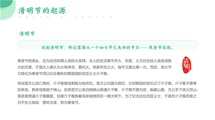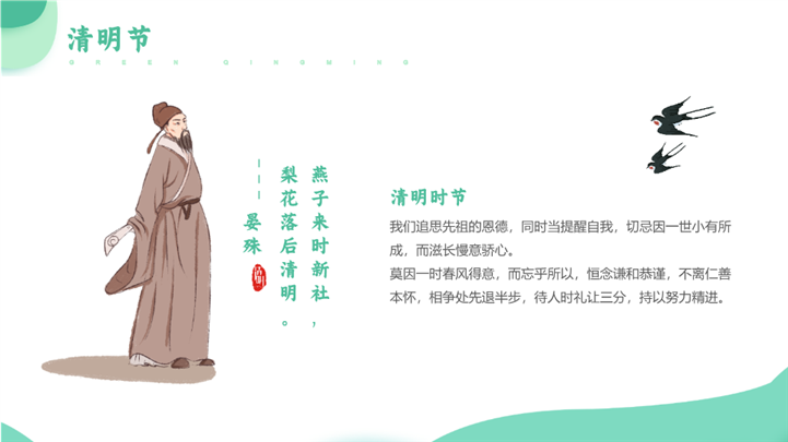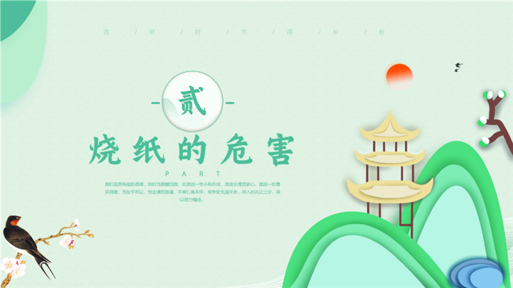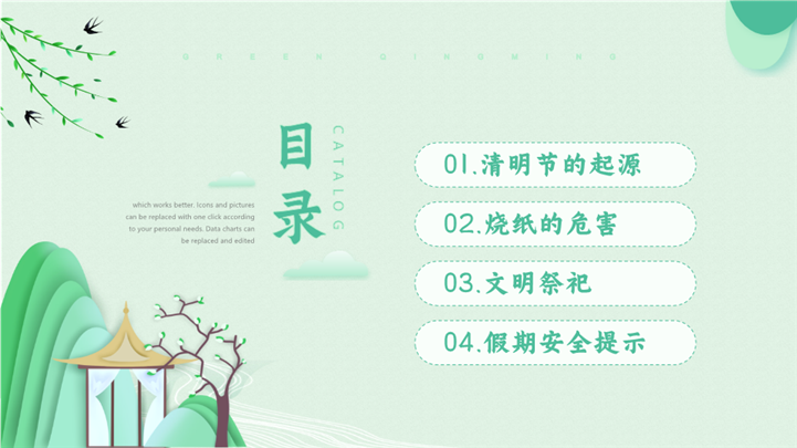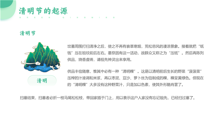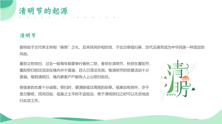 PPT简介: 文明祭祖绿色清明追思清明节ppt模板,淡绿色为主色调,整体界面简约风格,适用于清明、清明节、清明节班会、清明主题、烟雨清明、清明祭祖、清明节宣传、清明节传统节日等相关主题设计应用。主体文字及图片可替换修改,文字修改均可直接点击文本框进行编辑,图片更改可选中图片后单击鼠标右键插入更换图片,也可根据自身需求增加和删除。本作品提供PPTX格式文件,转载请注明出处!