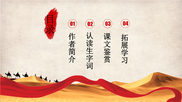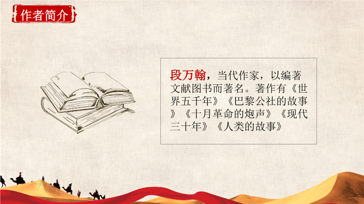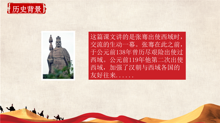 PPT简介: 大气简洁人教版五年级课文丝绸之路ppt课件,红色为主色调,整体界面大气简洁风格,适用于教学分析、教学设计、教学说课、教学方案、公开课、教师公开课、公开课课件、教师工作总结等相关主题设计应用。主体文字及图片可替换修改,文字修改均可直接点击文本框进行编辑,图片更改可选中图片后单击鼠标右键插入更换图片,也可根据自身需求增加和删除。本作品提供PPTX格式文件,转载请注明出处!