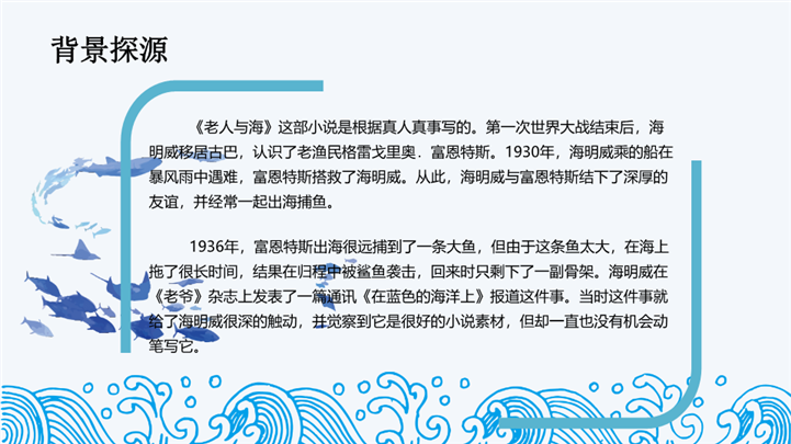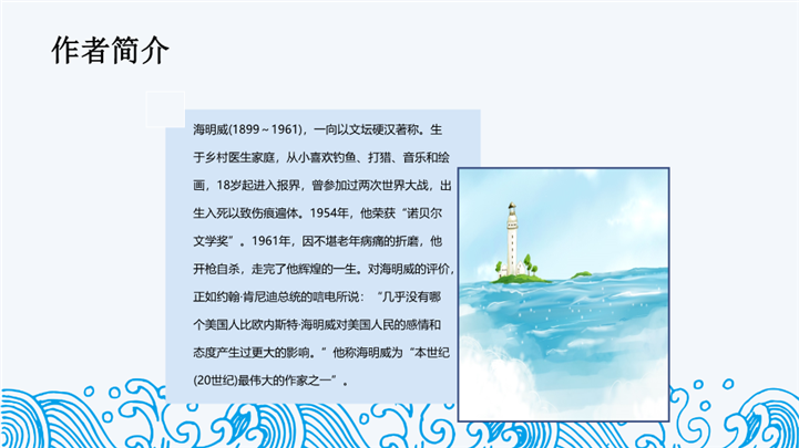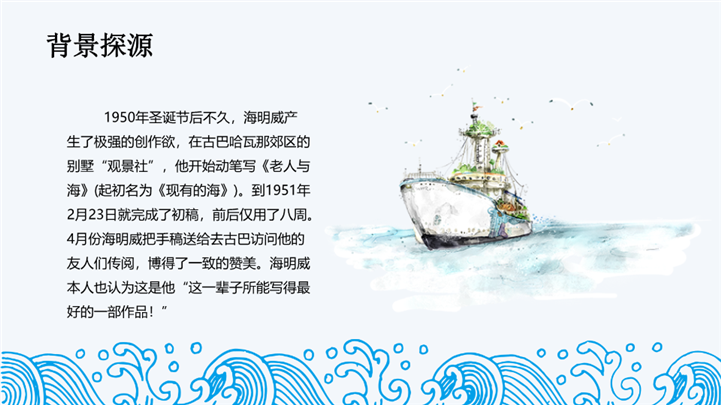 PPT简介: 国外名著导读《老人与海》教学课件ppt模板,浅蓝色为主色调,整体界面手绘简约风格,适用于读书感悟、名著导读、读书分享会、阅读分享、读书心得、教育培训课件、课程开发、讲师培训、学校教育等相关主题设计应用。主体文字及图片可替换修改,文字修改均可直接点击文本框进行编辑,图片更改可选中图片后单击鼠标右键插入更换图片,也可根据自身需求增加和删除。本作品提供PPTX格式文件,转载请注明出处!