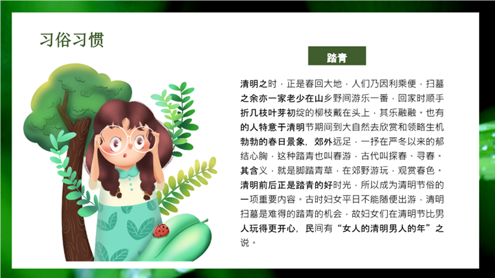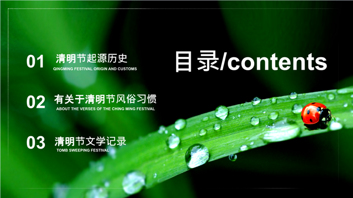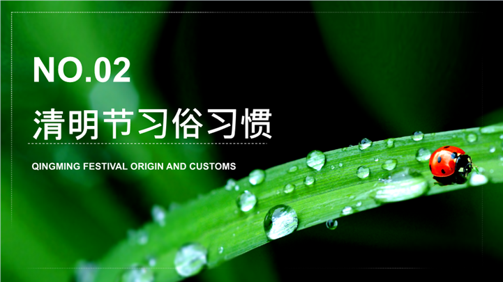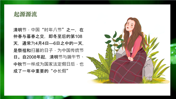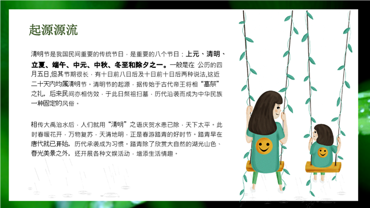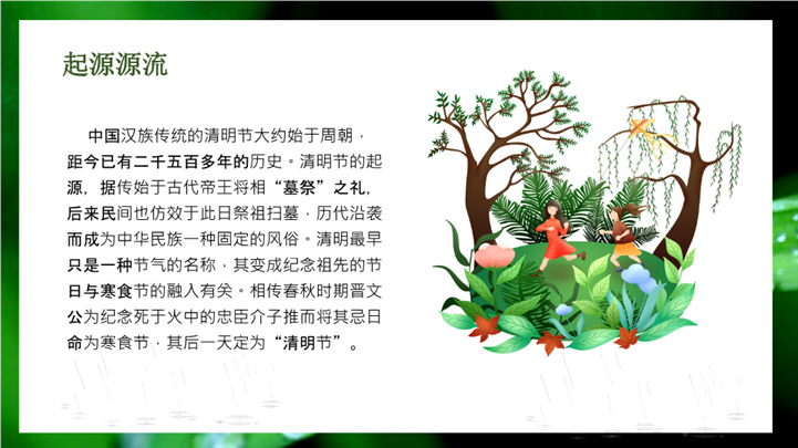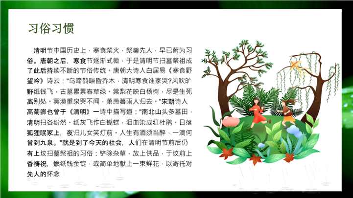 PPT简介: 清明雨上清明节扫墓祭祀传统节日ppt模板,绿色为主色调,整体界面清新风格,适用于清明、清明节、清明节班会、清明主题、烟雨清明、清明祭祖、清明节宣传、清明节传统节日等相关主题设计应用。主体文字及图片可替换修改,文字修改均可直接点击文本框进行编辑,图片更改可选中图片后单击鼠标右键插入更换图片,也可根据自身需求增加和删除。本作品提供PPTX格式文件,转载请注明出处!
