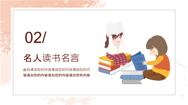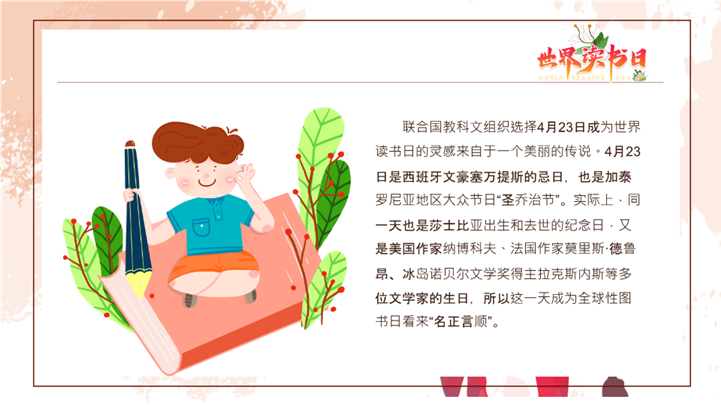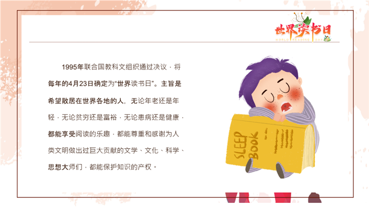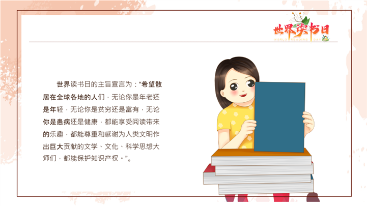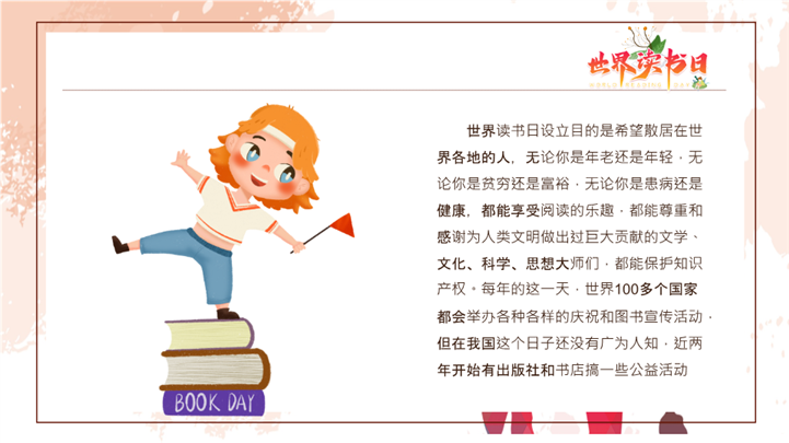 PPT简介: 清新卡通世界读书日阅读推广ppt模板,整体界面可爱卡通风格,适用于读书日宣传、读书日绍、读书日教育课件、世界读书日活动、活动策划报告、宣传与推广资料、教育讲座或研讨会、图书俱乐部会议、图书馆或书店活动、学校阅读项目等相关主题设计应用。主体文字及图片可替换修改,文字修改均可直接点击文本框进行编辑,图片更改可选中图片后单击鼠标右键插入更换图片,也可根据自身需求增加和删除。本作品提供PPTX格式文件,转载请注明出处!