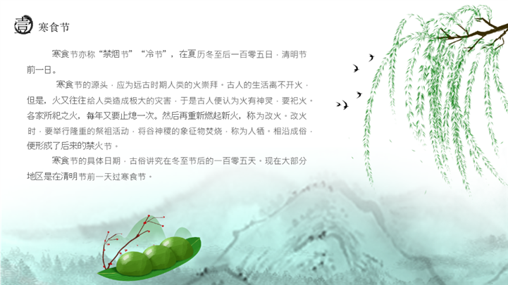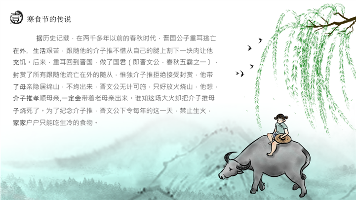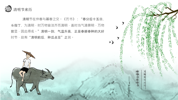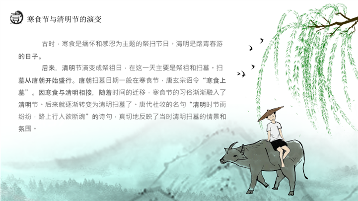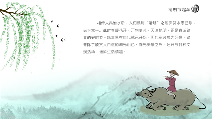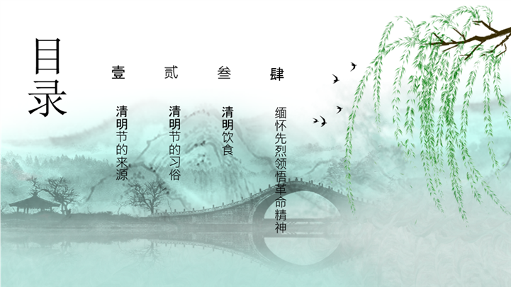 PPT简介: 春意盎然清明祭祖中国传统节日ppt模板,浅绿色为主色调,整体界面水墨中国风风格,适用于清明、清明节、清明节班会、清明主题、烟雨清明、清明祭祖、清明节宣传、清明节传统节日等相关主题设计应用。主体文字及图片可替换修改,文字修改均可直接点击文本框进行编辑,图片更改可选中图片后单击鼠标右键插入更换图片,也可根据自身需求增加和删除。本作品提供PPTX格式文件,转载请注明出处!