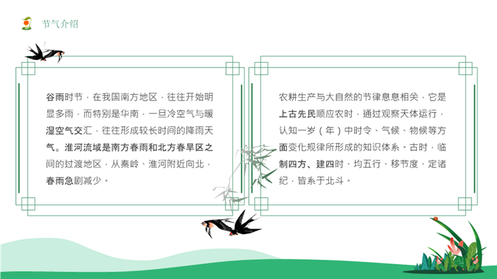 PPT简介: 清新自然中国传统节气谷雨ppt模板,绿色为主色调,整体界面清新自然风格,适用于谷雨、谷雨节气、谷雨主题教育、谷雨主题班会、谷雨24节气、中国传统节气、二十四节气、谷雨教育宣传等相关主题设计应用。主体文字及图片可替换修改,文字修改均可直接点击文本框进行编辑,图片更改可选中图片后单击鼠标右键插入更换图片,也可根据自身需求增加和删除。本作品提供PPTX格式文件,转载请注明出处!