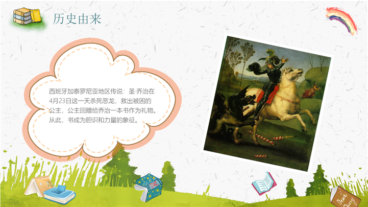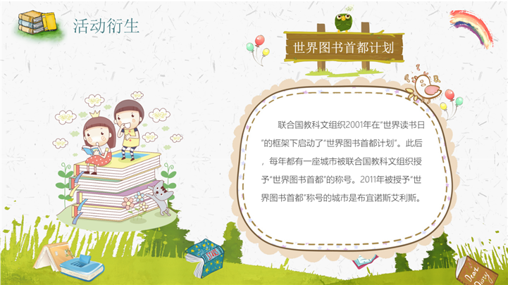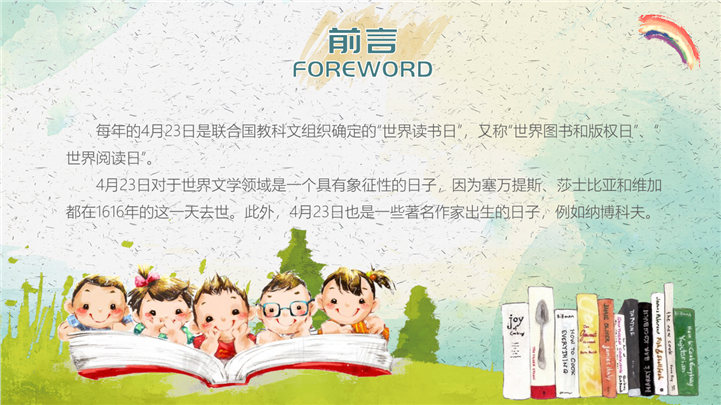 PPT简介: 怀旧卡通风格世界读书日阅读推广ppt模板,浅绿色为主色调,整体界面怀旧卡通风格,适用于读书日宣传、读书日绍、读书日教育课件、世界读书日活动、活动策划报告、宣传与推广资料、教育讲座或研讨会、图书俱乐部会议、图书馆或书店活动、学校阅读项目等相关主题设计应用。主体文字及图片可替换修改,文字修改均可直接点击文本框进行编辑,图片更改可选中图片后单击鼠标右键插入更换图片,也可根据自身需求增加和删除。本作品提供PPTX格式文件,转载请注明出处!