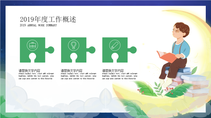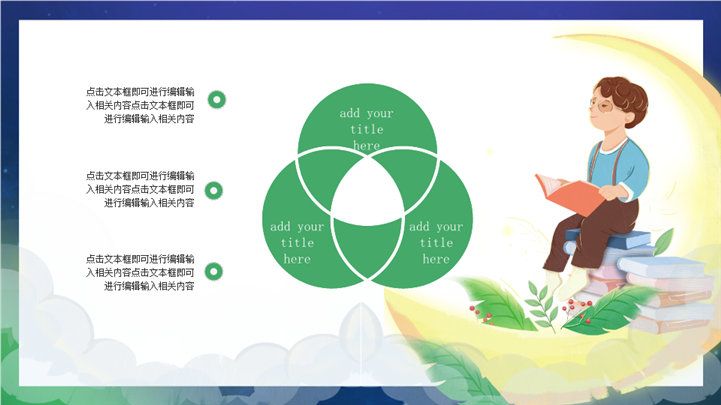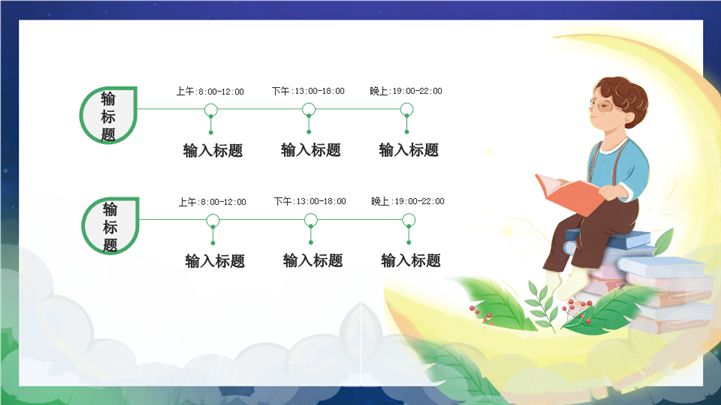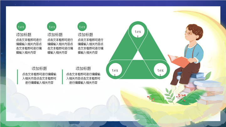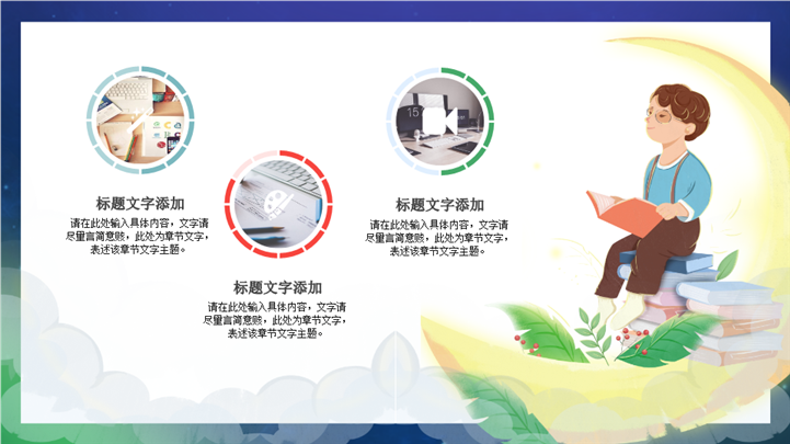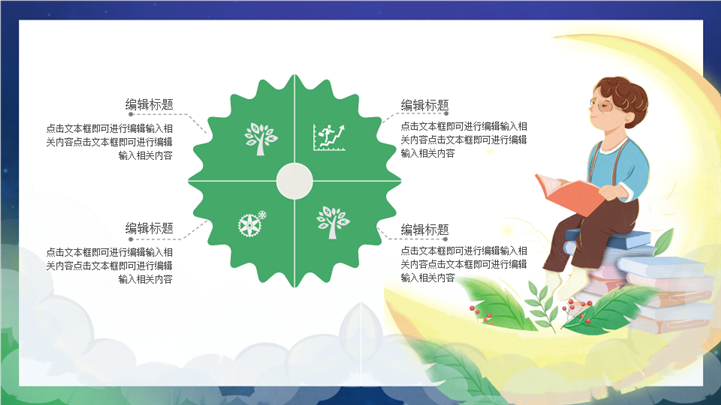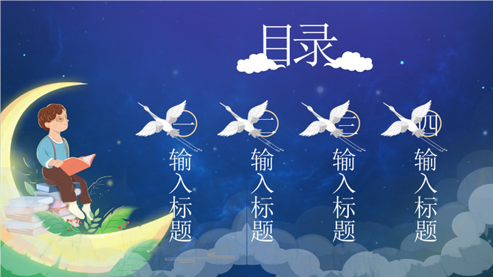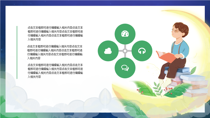 PPT简介: 梦幻星空读书日读书分享会班会ppt模板,蓝色为主色调,整体界面卡通风格,适用于读书日宣传、读书日绍、读书日教育课件、世界读书日活动、活动策划报告、宣传与推广资料、教育讲座或研讨会、图书俱乐部会议、图书馆或书店活动、学校阅读项目等相关主题设计应用。主体文字及图片可替换修改,文字修改均可直接点击文本框进行编辑,图片更改可选中图片后单击鼠标右键插入更换图片,也可根据自身需求增加和删除。本作品提供PPTX格式文件,转载请注明出处!