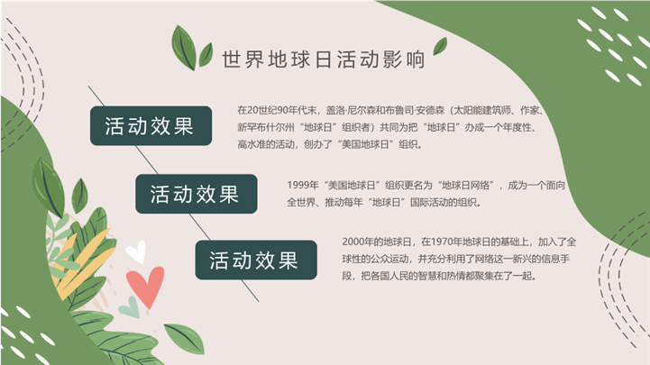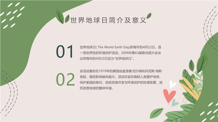 PPT简介: 世界地球日绿色希望主题班会ppt模板,浅绿色为主色调,整体界面手绘风格,适用于环保宣传、环保教育活动、地球日相关的公益活动或校园活动策划、环保教育课件、世界地球日、世界地球日班会等相关主题设计应用。主体文字及图片可替换修改,文字修改均可直接点击文本框进行编辑,图片更改可选中图片后单击鼠标右键插入更换图片,也可根据自身需求增加和删除。本作品提供PPTX格式文件,转载请注明出处!