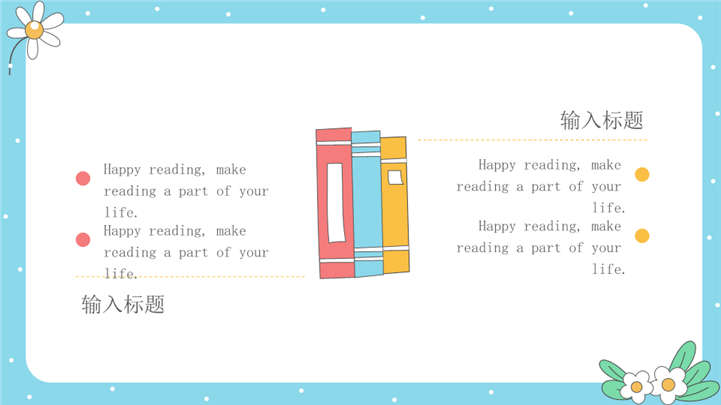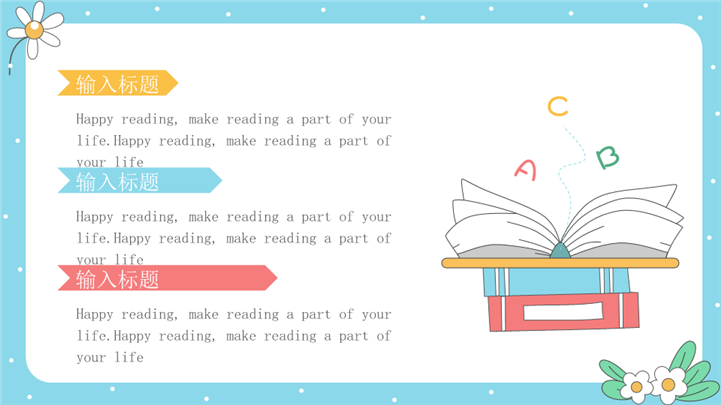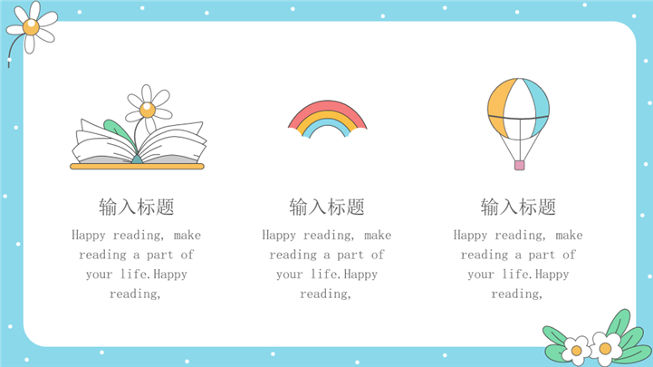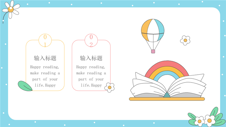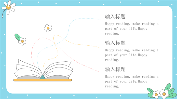 PPT简介: 清新活泼快乐世界读书日主题ppt模板,浅蓝色为主色调,整体界面卡通风格,适用于读书日宣传、读书日绍、读书日教育课件、世界读书日活动、活动策划报告、宣传与推广资料、教育讲座或研讨会、图书俱乐部会议、图书馆或书店活动、学校阅读项目等相关主题设计应用。主体文字及图片可替换修改,文字修改均可直接点击文本框进行编辑,图片更改可选中图片后单击鼠标右键插入更换图片,也可根据自身需求增加和删除。本作品提供PPTX格式文件,转载请注明出处!
