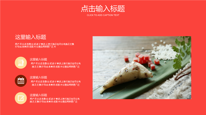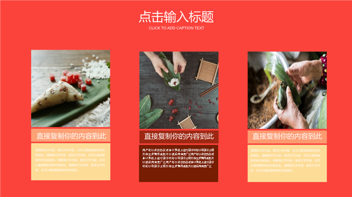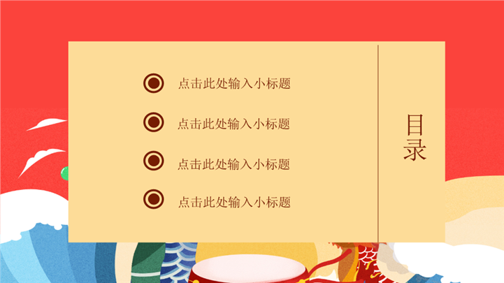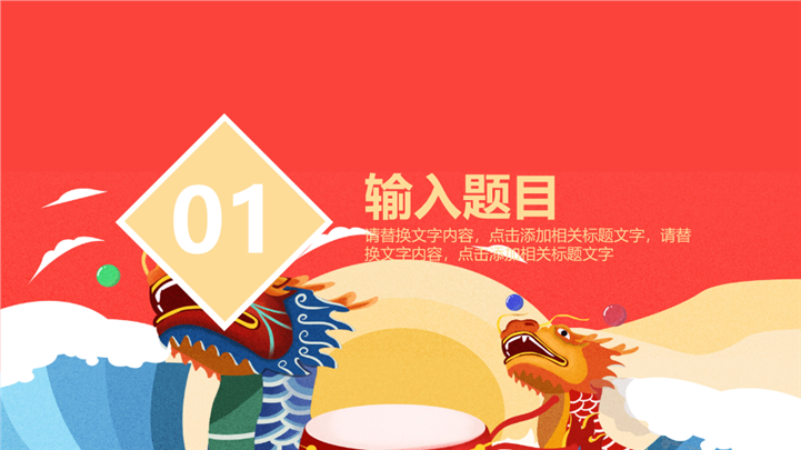 PPT简介: 端午节传统龙舟竞渡节日活动策划ppt模板,适用于端午节等相关主题设计应用。主体文字及图片可替换修改,文字修改均可直接点击文本框进行编辑,图片更改可选中图片后单击鼠标右键插入更换图片,也可根据自身需求增加和删除。本作品提供PPTX格式文件,转载请注明出处!