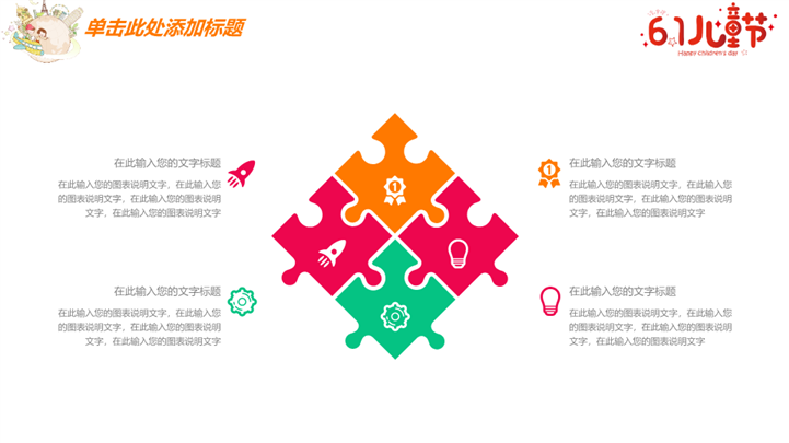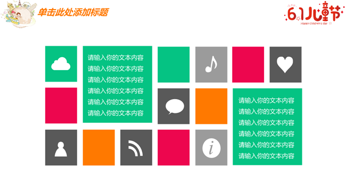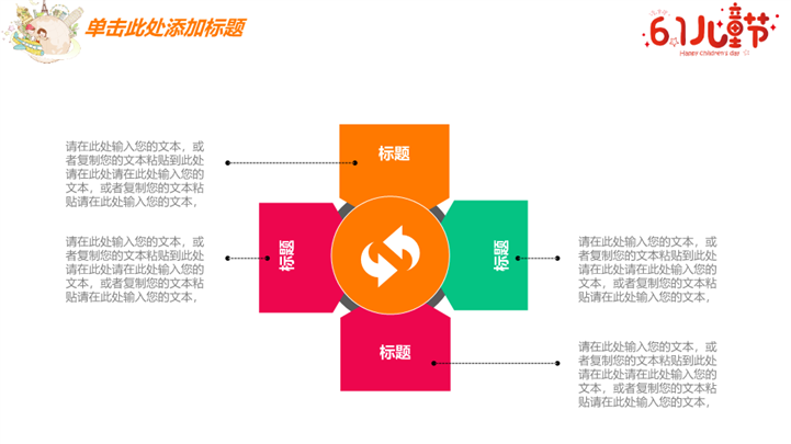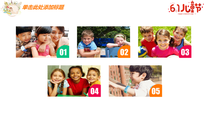PPT简介: 多彩卡通六一儿童节活动汇报ppt模板,适用于六一儿童节主题设计应用。主体文字及图片可替换修改,文字修改均可直接点击文本框进行编辑,图片更改可选中图片后单击鼠标右键插入更换图片,也可根据自身需求增加和删除。本作品提供PPTX格式文件,转载请注明出处!