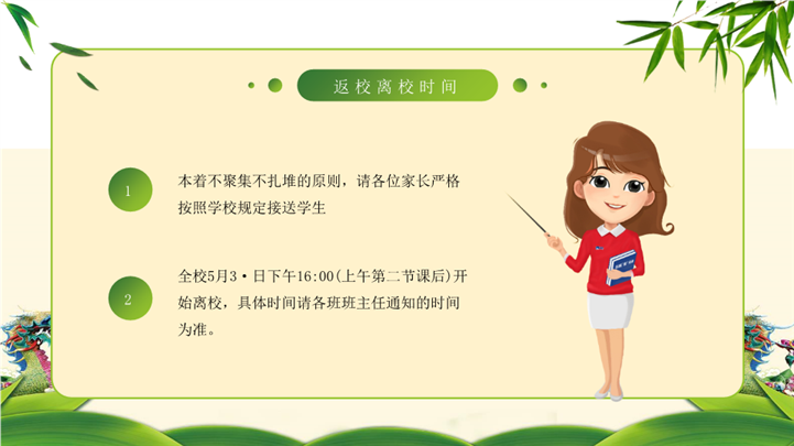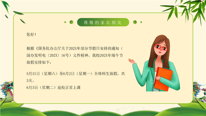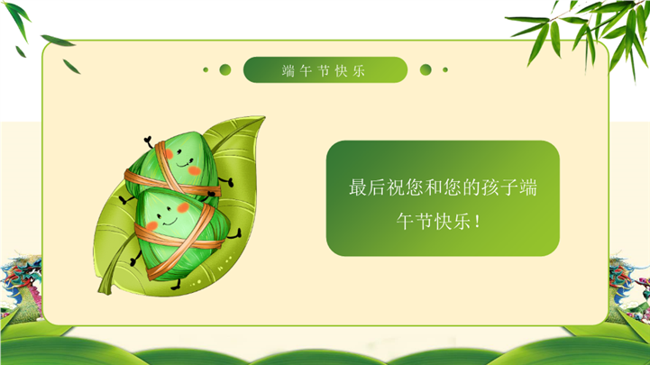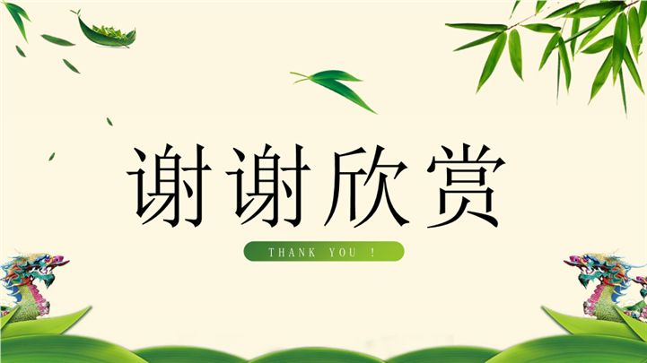 PPT简介: 简约大气传统风格端午节假期安排通知ppt模板,适用于端午节相关主题设计应用。主体文字及图片可替换修改,文字修改均可直接点击文本框进行编辑,图片更改可选中图片后单击鼠标右键插入更换图片,也可根据自身需求增加和删除。本作品提供PPTX格式文件,转载请注明出处!