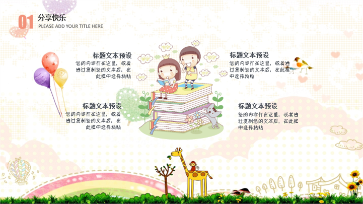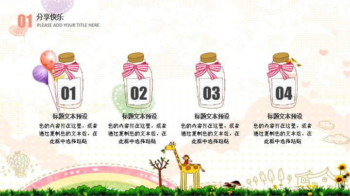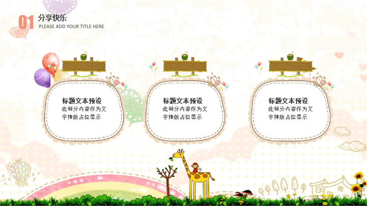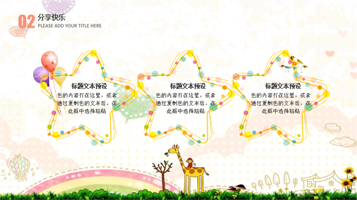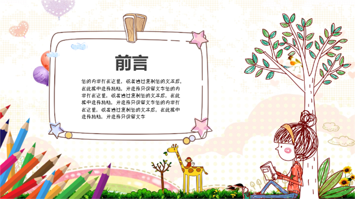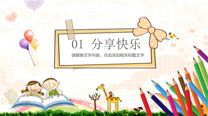 PPT简介: 温馨亲子幼儿园儿童节活动策划卡通ppt模板,适用于儿童节等相关主题设计应用。主体文字及图片可替换修改,文字修改均可直接点击文本框进行编辑,图片更改可选中图片后单击鼠标右键插入更换图片,也可根据自身需求增加和删除。本作品提供PPTX格式文件,转载请注明出处!