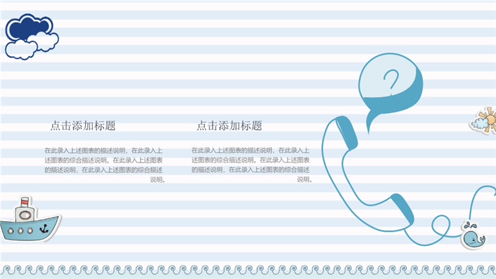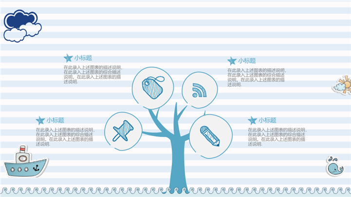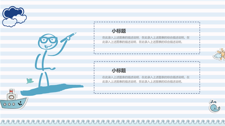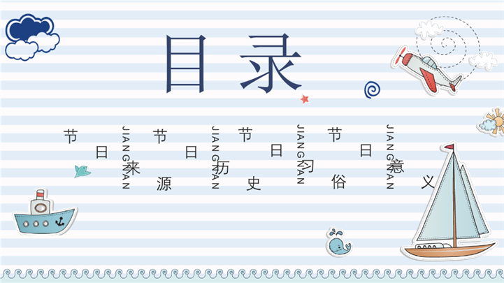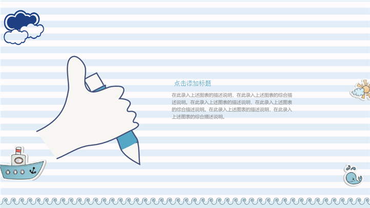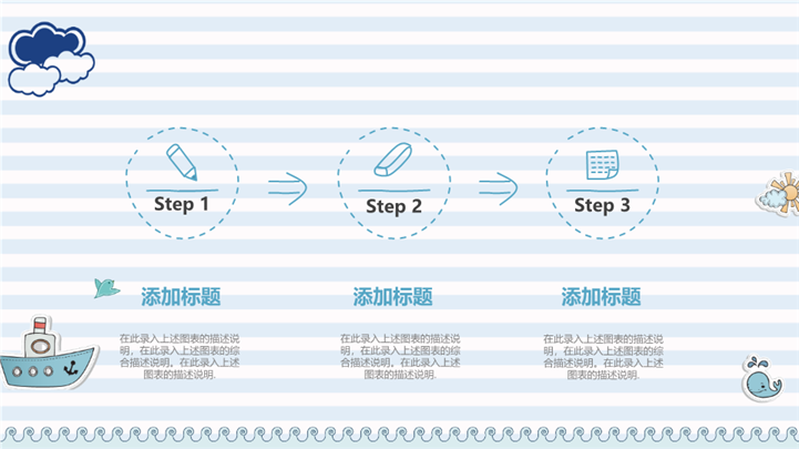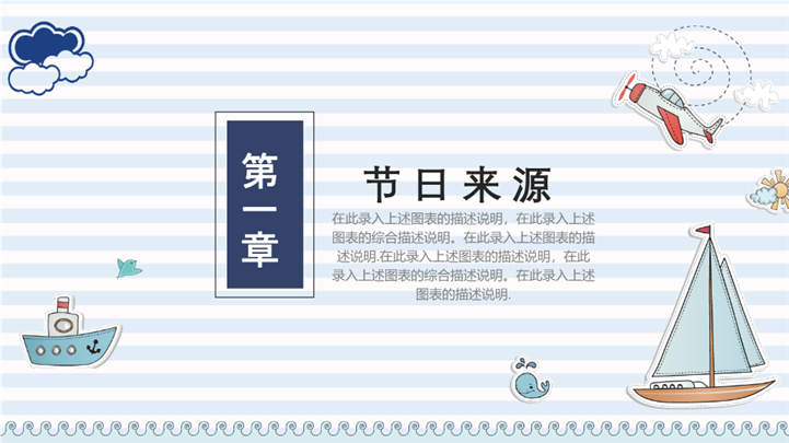 PPT简介: 缤纷六一快乐有礼卡通航海主题ppt模板,适用于六一儿童节等相关主题设计应用。主体文字及图片可替换修改,文字修改均可直接点击文本框进行编辑,图片更改可选中图片后单击鼠标右键插入更换图片,也可根据自身需求增加和删除。本作品提供PPTX格式文件,转载请注明出处!