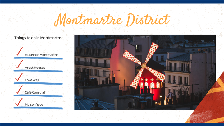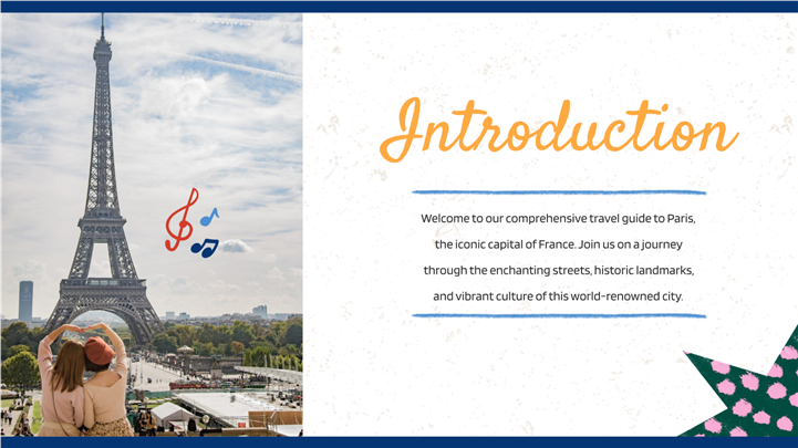 PPT简介: 创意手绘涂鸦手帐风法国巴黎旅行攻略ppt模板,适用于巴黎旅行攻略等相关主题设计应用。主体文字及图片可替换修改,文字修改均可直接点击文本框进行编辑,图片更改可选中图片后单击鼠标右键插入更换图片,也可根据自身需求增加和删除。本作品提供PPTX格式文件,转载请注明出处!