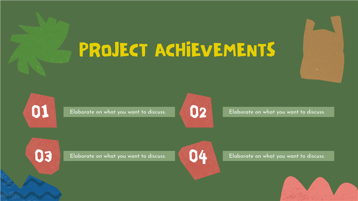 PPT简介: 创意剪纸拼贴风环保公益活动策划ppt模板,适用于环保公益活动策划、垃圾分类科普宣讲、可持续发展项目报告、或学校的环保主题班会等相关主题设计应用。主体文字及图片可替换修改,文字修改均可直接点击文本框进行编辑,图片更改可选中图片后单击鼠标右键插入更换图片,也可根据自身需求增加和删除。本作品提供PPTX格式文件,转载请注明出处!