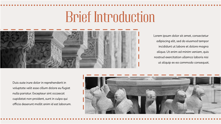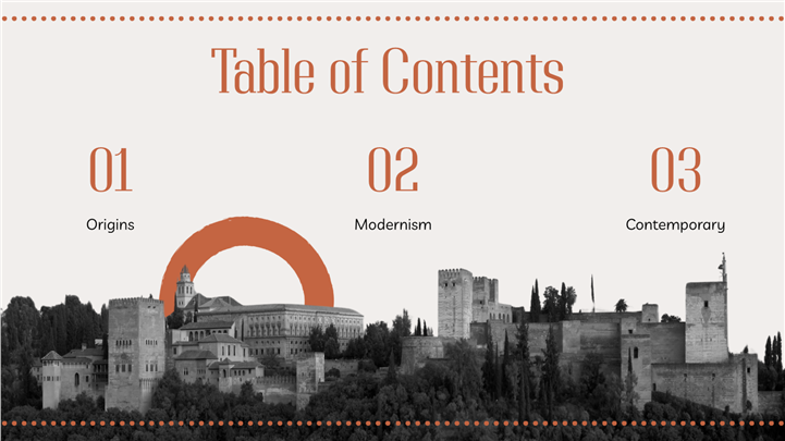 PPT简介: 复古手绘风西班牙文化建筑历史介绍PPT模板,以棕色和土橘色为主,带有复古手绘和建筑插画的风格,适用于展示历史、文化、艺术、建筑或人文社科等相关主题设计应用。主体文字及图片可替换修改,文字修改均可直接点击文本框进行编辑,图片更改可选中图片后单击鼠标右键插入更换图片,也可根据自身需求增加和删除。本作品提供PPTX格式文件,转载请注明出处!