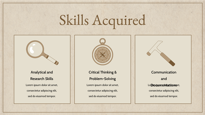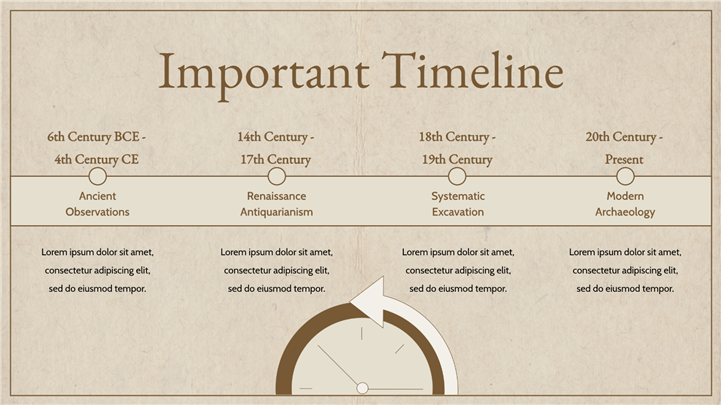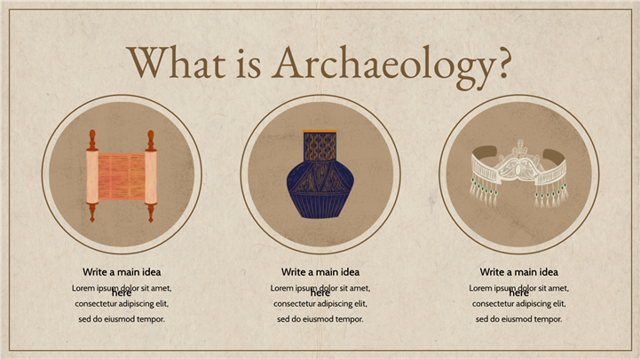 PPT简介: 复古雅致的大地色系考古学研究学术报告PPT模板,设计简洁,以复古和大地色系为主,适用于展示学术研究、历史文化、教育培训等相关主题设计应用。主体文字及图片可替换修改,文字修改均可直接点击文本框进行编辑,图片更改可选中图片后单击鼠标右键插入更换图片,也可根据自身需求增加和删除。本作品提供PPTX格式文件,转载请注明出处!