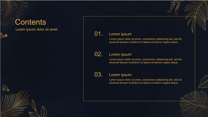 PPT简介: 黑金植物线条商业金融投资ppt模板,适用于金融投资 (商业融资路演 - Pitch Deck)、营销宣传 (高端品牌、奢侈品)、工作总结 (年度报告)、工作复盘、月度总结、月度复盘、计划总结、商务总结、工作总结、总结汇报、商务汇报等相关主题设计应用。主体文字及图片可替换修改,文字修改均可直接点击文本框进行编辑,图片更改可选中图片后单击鼠标右键插入更换图片,也可根据自身需求增加和删除。本作品提供PPTX格式文件,转载请注明出处!