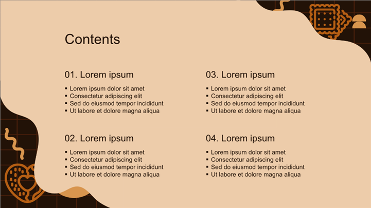 PPT简介: 棕色系饼干插画风烘焙甜品品牌营销ppt模板,适用于餐饮美食 (核心匹配:烘焙、甜品店、饼干品牌)、营销宣传 (新品发布、品牌策划)、教育培训 (烘焙课件)等相关主题设计应用。主体文字及图片可替换修改,文字修改均可直接点击文本框进行编辑,图片更改可选中图片后单击鼠标右键插入更换图片,也可根据自身需求增加和删除。本作品提供PPTX格式文件,转载请注明出处!
