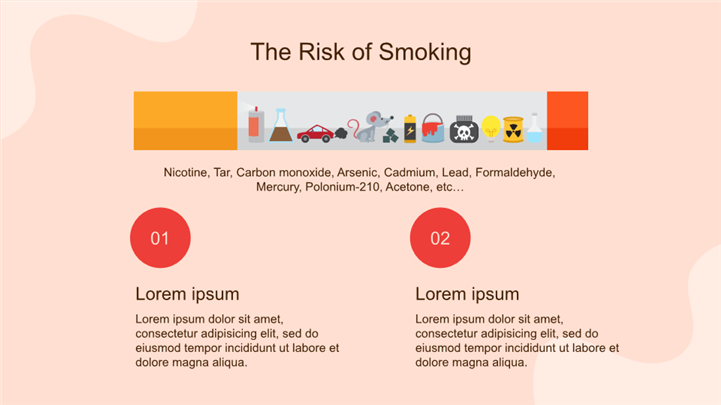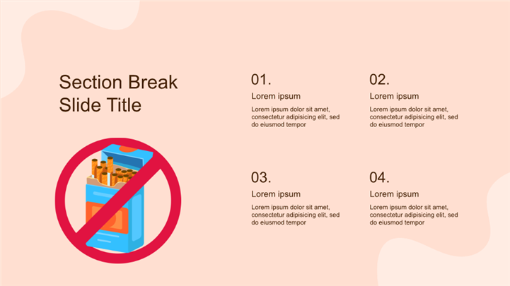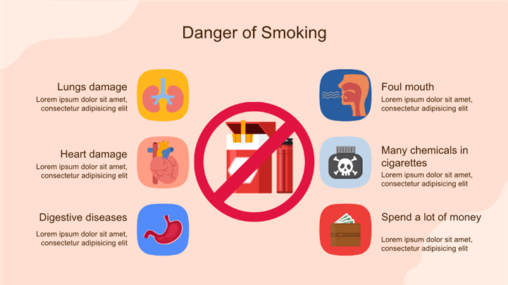 PPT简介: 简约扁平插画风戒烟健康教育ppt模板,适用于医疗健康 (核心匹配:控烟、戒烟、健康教育)、教育培训 (主题班会)、节日庆典 (5月31日世界无烟日)等相关主题设计应用。主体文字及图片可替换修改,文字修改均可直接点击文本框进行编辑,图片更改可选中图片后单击鼠标右键插入更换图片,也可根据自身需求增加和删除。本作品提供PPTX格式文件,转载请注明出处!