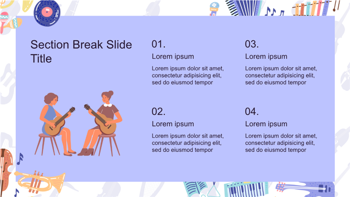 PPT简介: 创意多彩插画风少儿音乐培训ppt模板,适用于教育培训 (核心匹配:音乐学校、艺术课件、兴趣班招生)、营销宣传 (乐器店、音乐节)、节日庆典 (校园音乐会)等相关主题设计应用。主体文字及图片可替换修改,文字修改均可直接点击文本框进行编辑,图片更改可选中图片后单击鼠标右键插入更换图片,也可根据自身需求增加和删除。本作品提供PPTX格式文件,转载请注明出处!