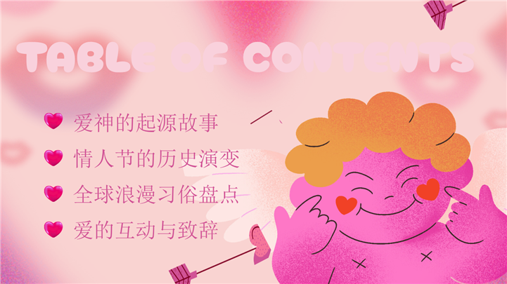 PPT简介: 唯美粉色浪漫情人节活动策划PPT模板,这款唯美粉色情人节主题PPT模板专为节日活动策划及西方文化科普设计。画面充满梦幻云朵、爱心与丘比特天使插画,氛围浪漫甜蜜。模板内含爱神传说介绍、各国节日习俗、互动问答及表白信纸版式,非常适合英语选修课、恋爱心理学讲座及商场节日促销。主体文字及图片可替换修改,文字修改均可直接点击文本框进行编辑,图片更改可选中图片后单击鼠标右键插入更换图片,也可根据自身需求增加和删除。本作品提供PPTX格式文件,转载请注明出处!